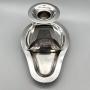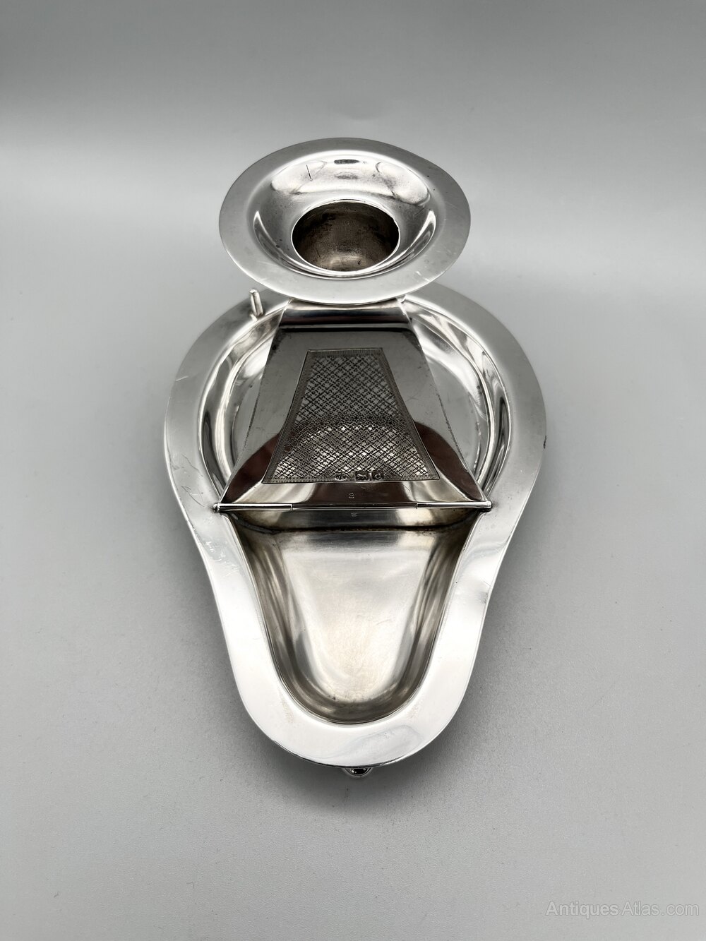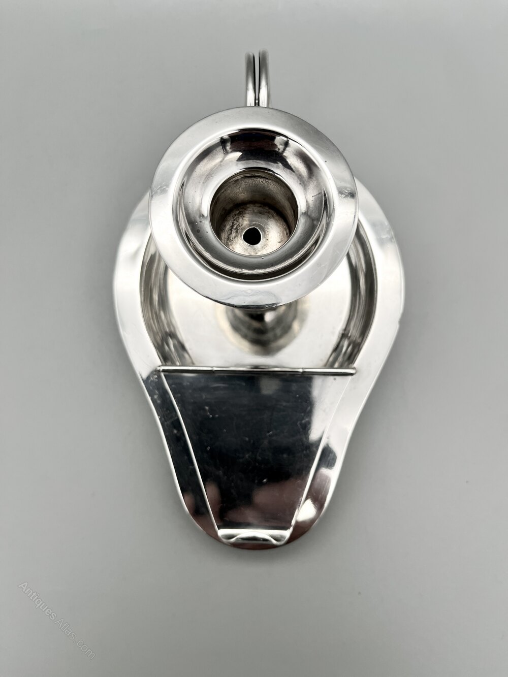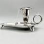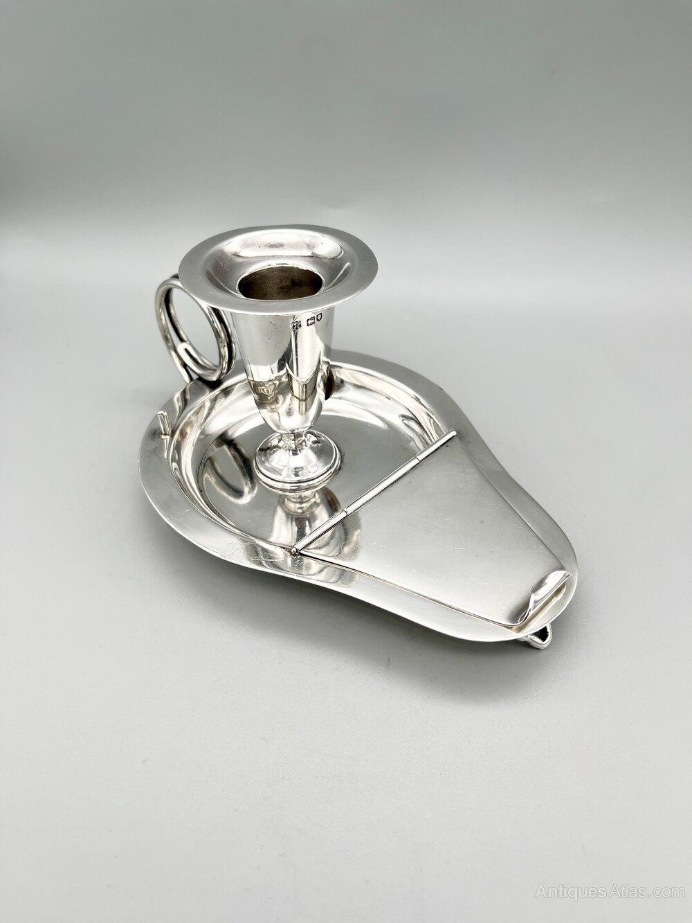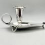 The chamberstick is 17cm / 6.7ins from front to handle, 10.4cm / 4.1ins across at its widest point and stands 7.6cm / 3ins high. It weighs in at a substantial 236.4g / 8.34oz / 7.60toz of solid Sterling Silver.