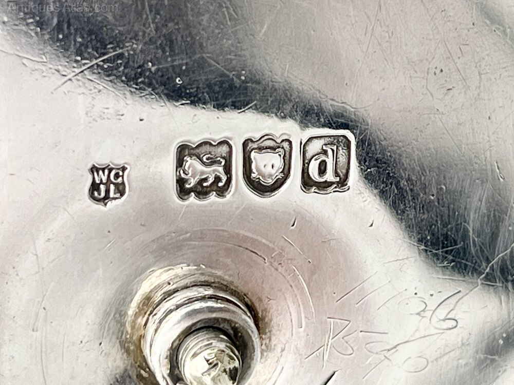 The hallmarks, on the underside of the base, are well struck and clear to read. They show the lion passant for Sterling Silver, the leopard's head assay mark for London, the date letter d for 1899 and the W G over J L makers' mark for William Gibson and John Langman of The Goldsmiths & Silversmiths Co.