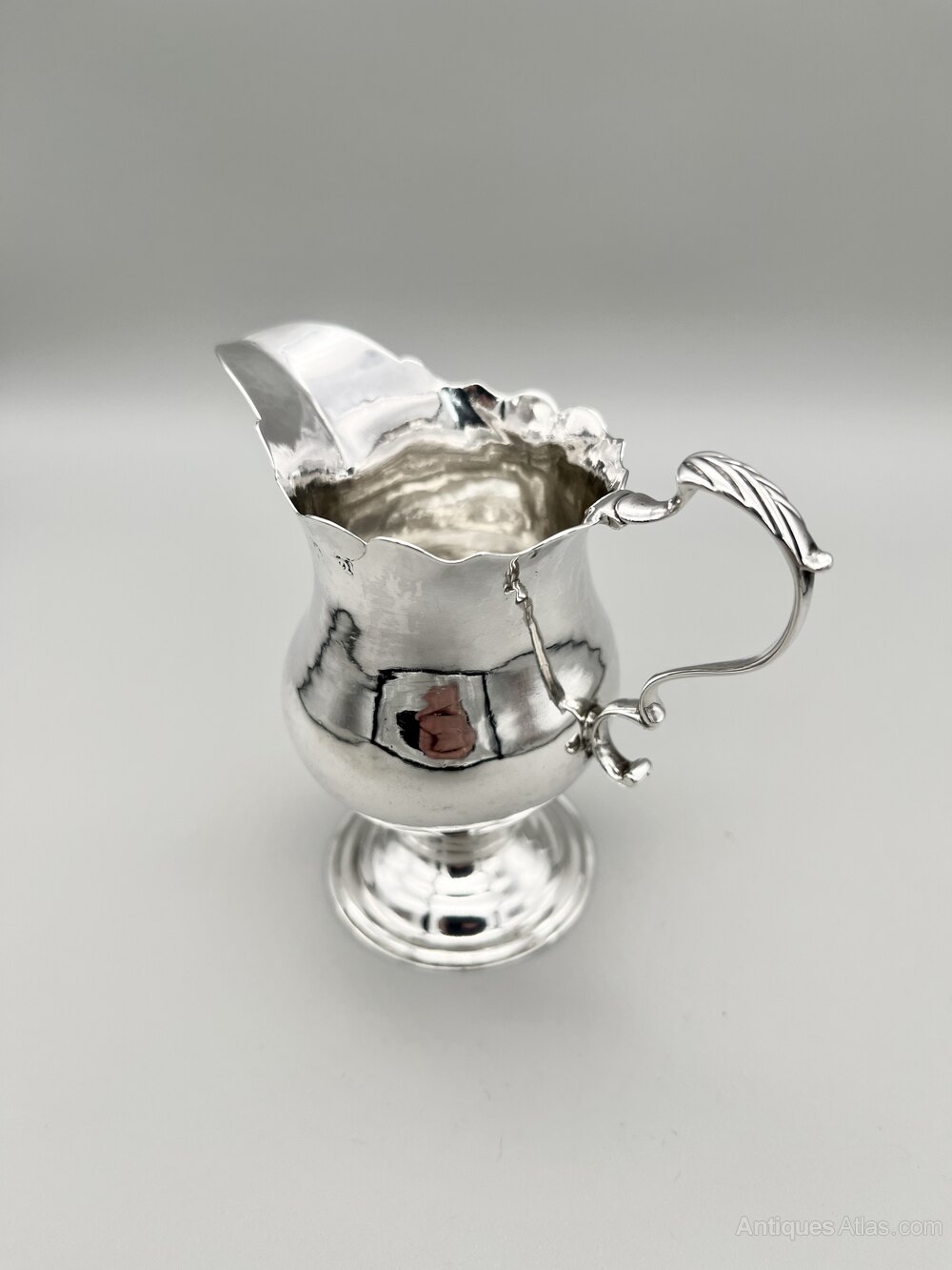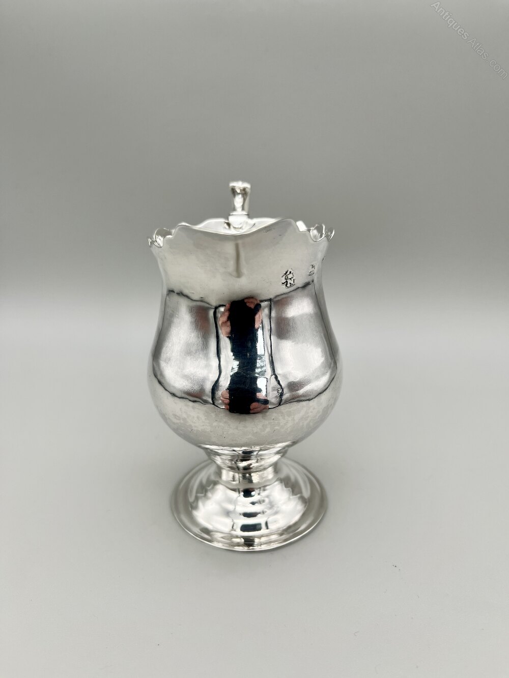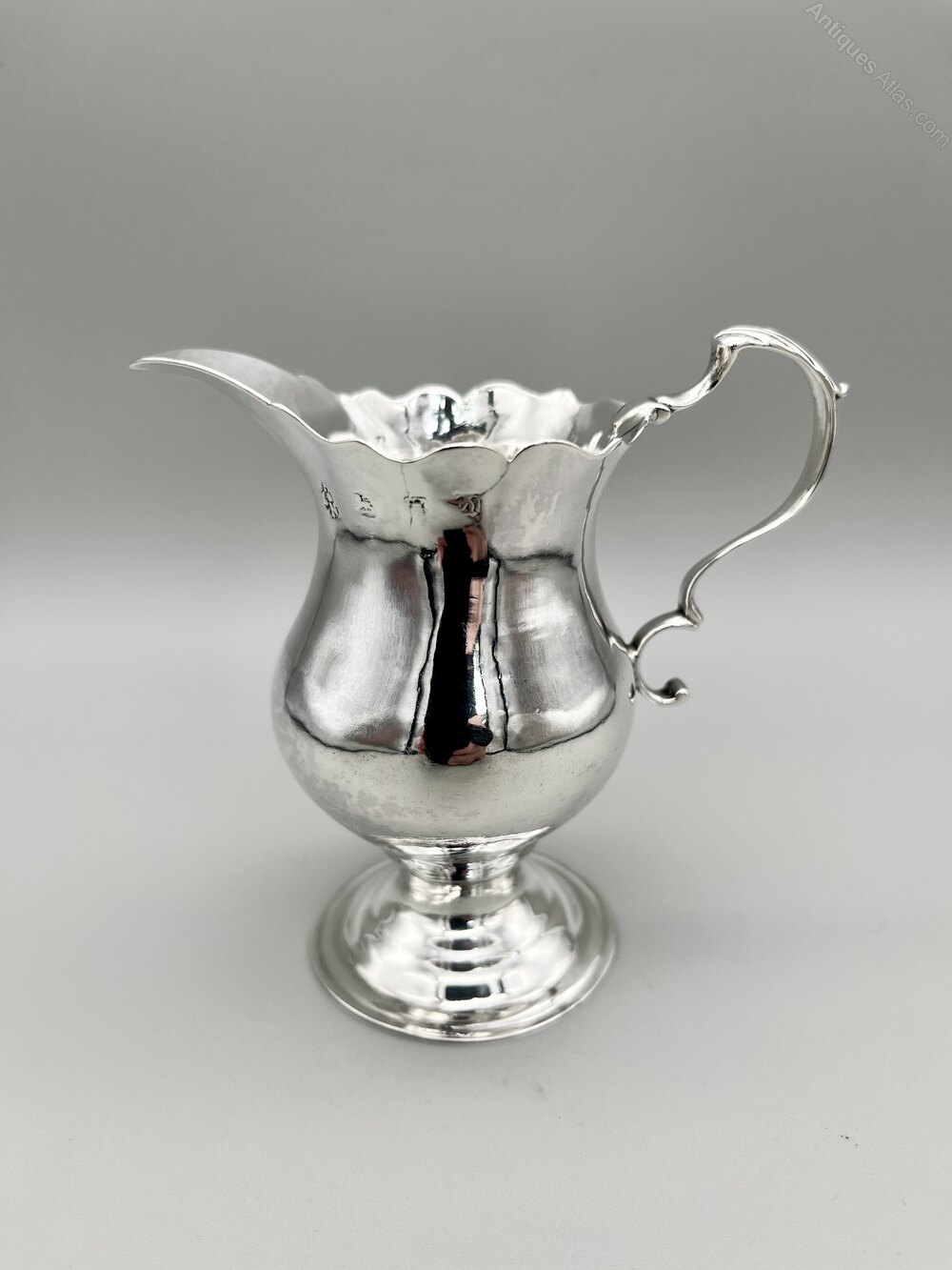 This is an elegant early George III Sterling Silver Cream Jug. The jug has a spreading flat circular base, a short stem and a pear shaped body with a wavy top rim. There is a scroll handle with geometric decoration on the thumb rest. There are no initials or personalisation of any kind.The cream jug was made in London in 1771 by silversmiths I S & A N. This firm is a bit of a mystery as their mark is not in the records and was almost certainly in one of the two lost registers from the middle years of the 18th century. They were definitely active from the early 1860s to the early 1870s and may well have been in business either side of those dates too.