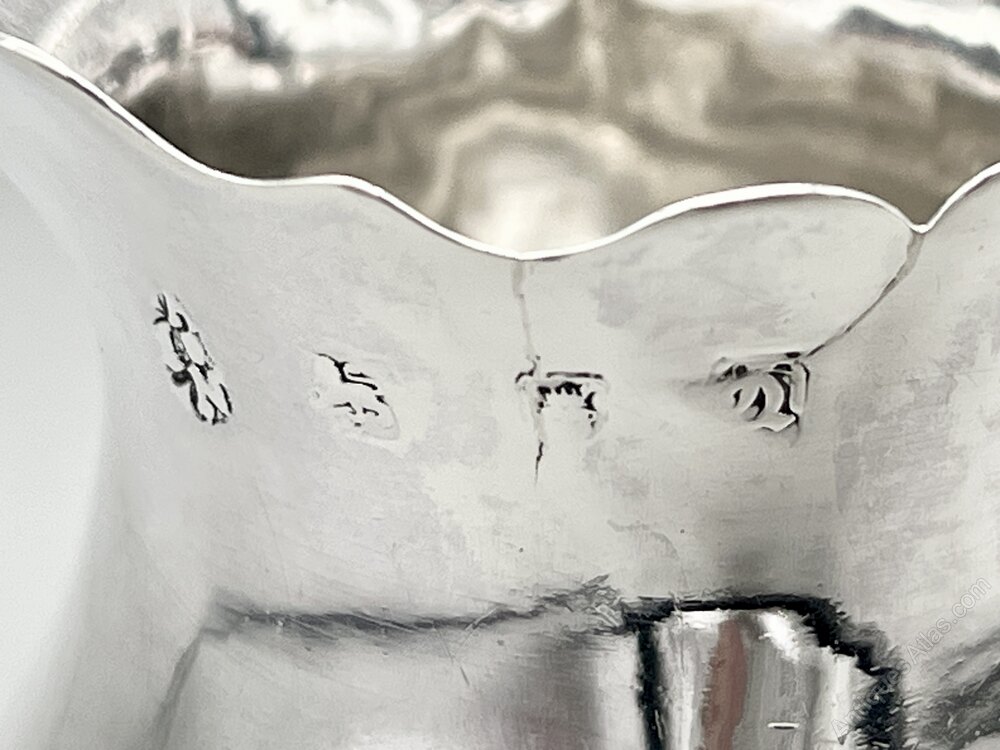 The hallmarks, on the outside just below the rim, are somewhat rubbed but can still be read. They show the lion passant for Sterling Silver, the crowned leopard's head assay mark for London, the date letter Q for 1771 and the I S . A N in a quatrefoil makers' mark for our mysterious silversmiths.