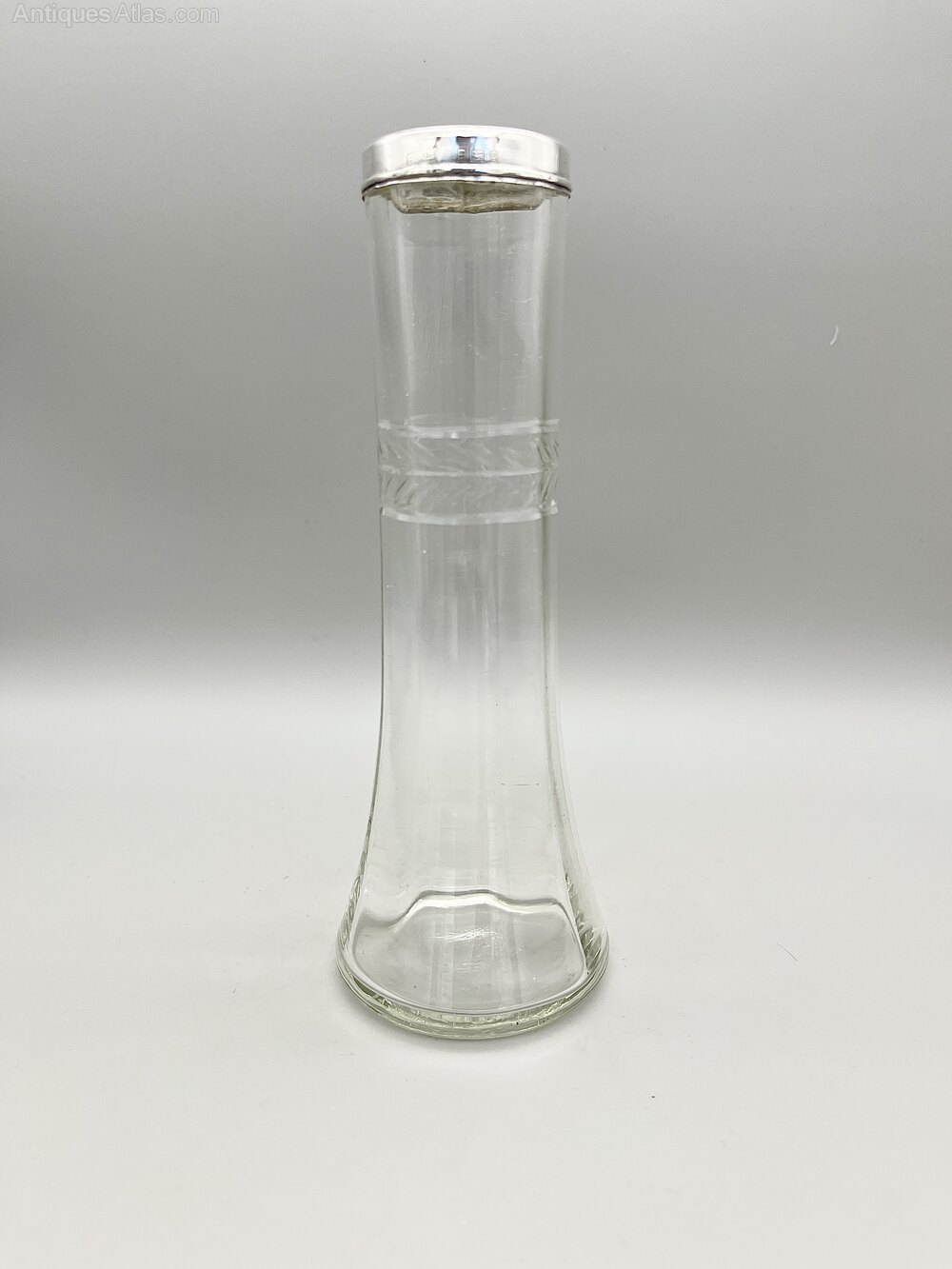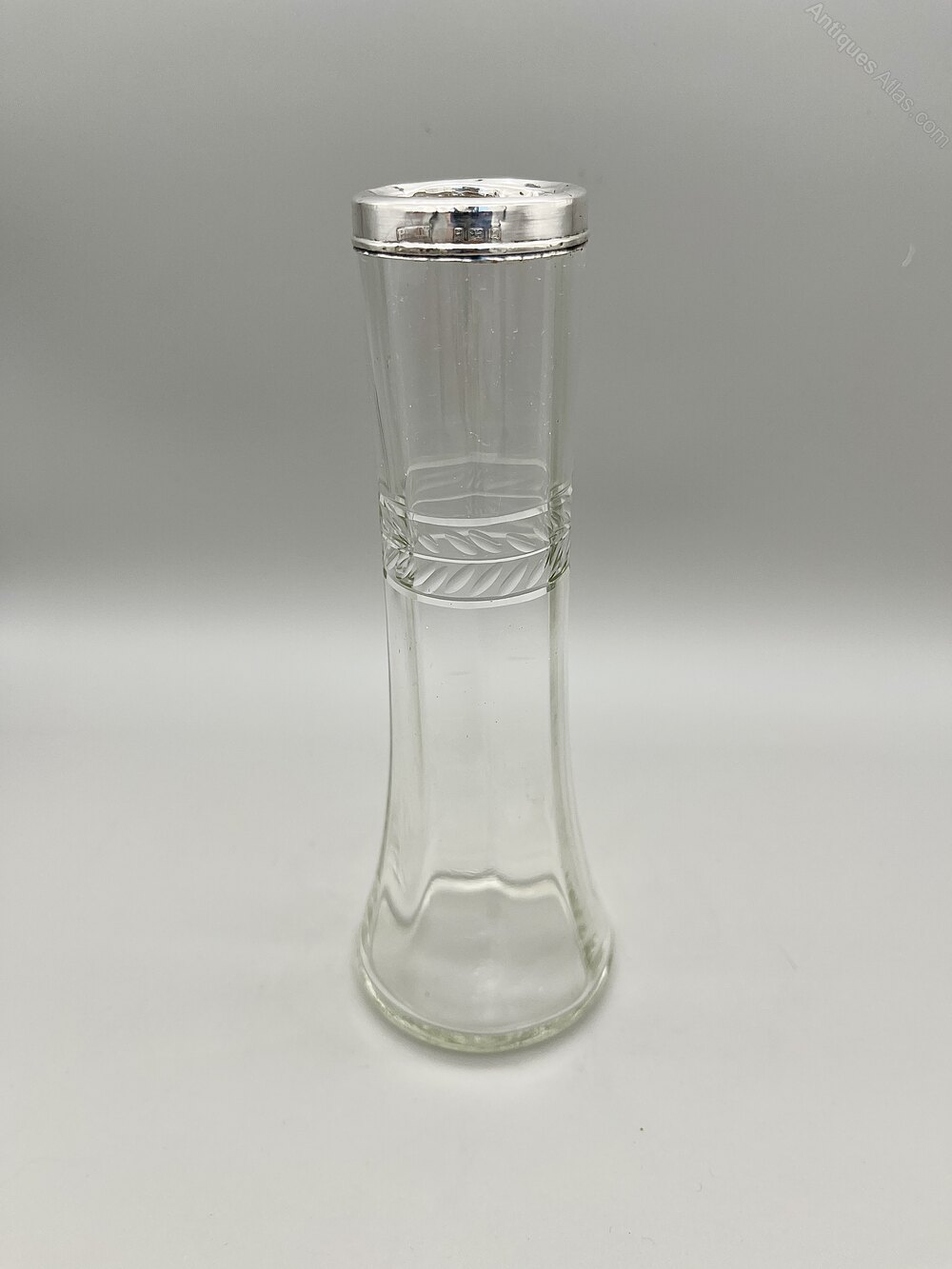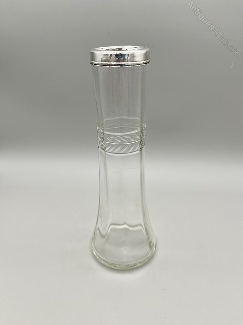 This is an elegant George V Glass Vase with a Sterling Silver Top Rim. The handblown glass vase has a circular flat base, pannelled tapered sides and a band of leaf decoration around the upper part of the body.The vase was made in London by Henry Williamson Ltd and dates to 1924. Henry Williamson opened his first premises in London's Farringdon Street in 1879. The firm expanded to became Henry Williamson Ltd in 1894, opened a manufacturing premises in Spencer Street, Birmingham and also commissioned pieces from Sheffield, all to run alongside the London showroom. They specialised in small silverware items for the dining table, the dressing table or for personal use. The company finally ceased trading in the late 1920s.