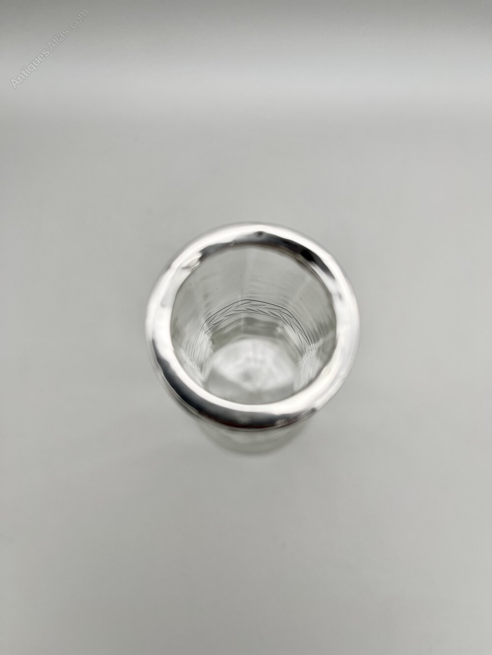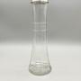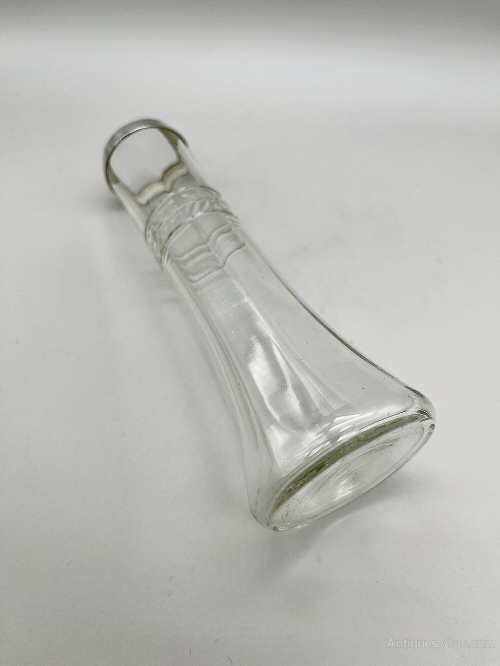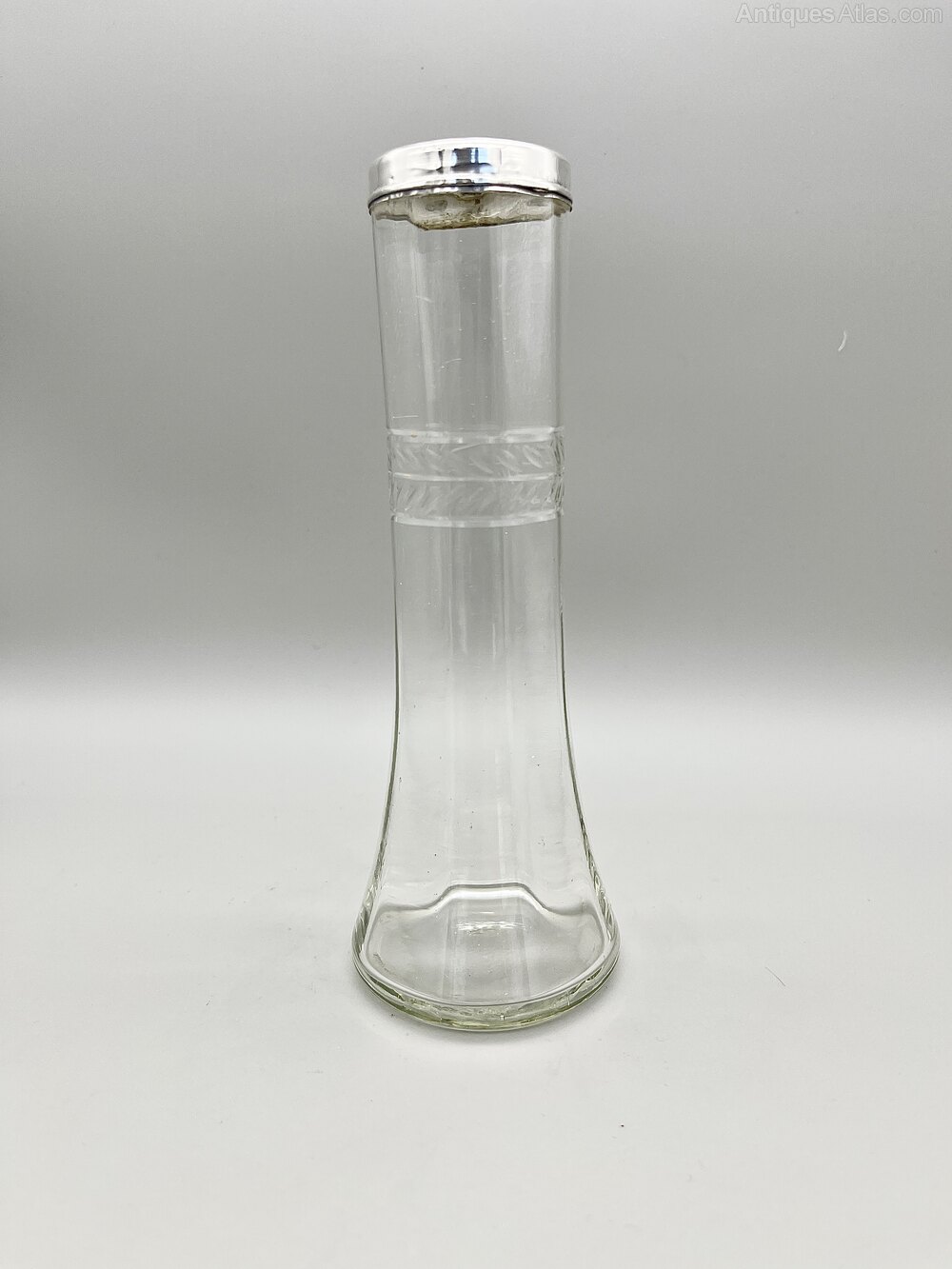 This is an elegant George V Glass Vase with a Sterling Silver Top Rim. The handblown glass vase has a circular flat base, pannelled tapered sides and a band of leaf decoration around the upper part of the body.The vase was made in London by Henry Williamson Ltd and dates to 1924. Henry Williamson opened his first premises in London's Farringdon Street in 1879. The firm expanded to became Henry Williamson Ltd in 1894, opened a manufacturing premises in Spencer Street, Birmingham and also commissioned pieces from Sheffield, all to run alongside the London showroom. They specialised in small silverware items for the dining table, the dressing table or for personal use. The company finally ceased trading in the late 1920s.