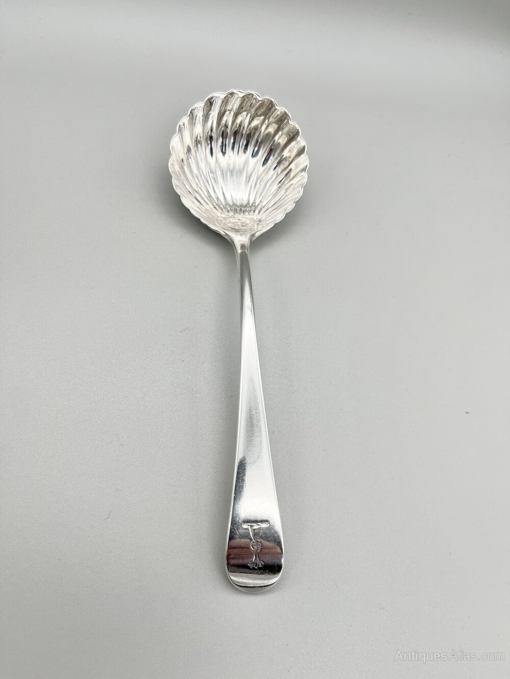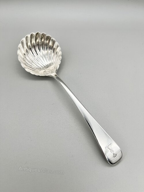 Here we have a fine quality George II Sterling Silver Sauce Ladle. The ladle has an arching stem and a shell bowl. A crest of a bear's arm holding a torch is engraved at the top of the stem.The sauce ladle was made in London by silversmith Isaac Callard and dates to 1753. Isaac Callard registered his first mark at Goldsmith’s Hall in London in 1726. He was an important silversmith of Huguenot descent who specialised in spoons and flatware. He had a long and successful career right up to his death in 1770. Isaac’s son Paul Callard registered his own mark in 1752 also specialising in spoons and flatware.