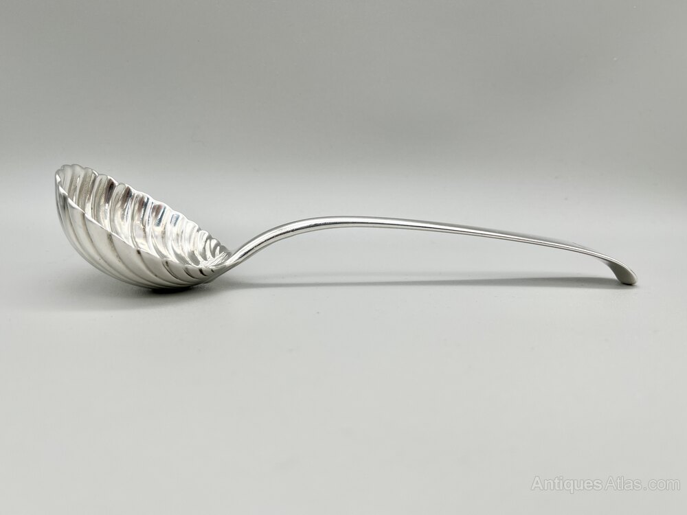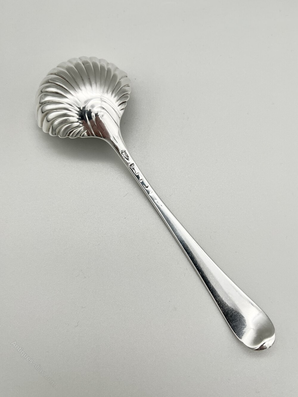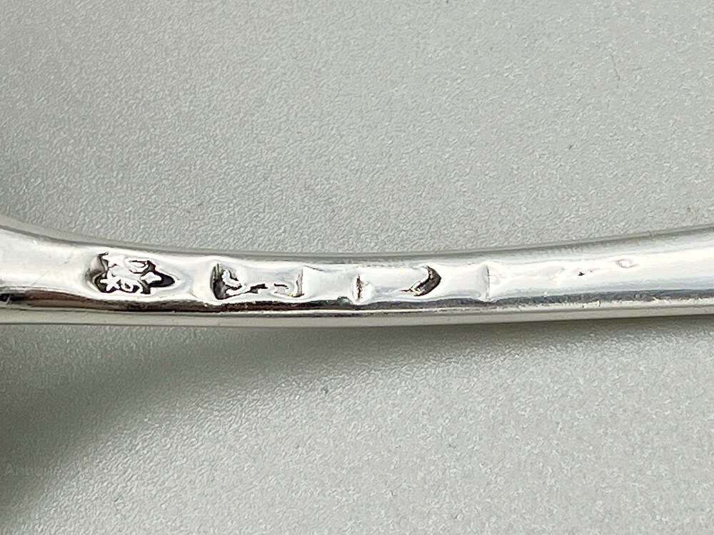 As you would expect on flatware from ths era, the sauce ladle is bottom struck and the hallmarks are somewhat distorted but can still be read. They show the lion passant for Sterling Silver, the crowned leopard's head assay mark for London, the slightly strange date letter s for 1753 and the I C below two stars makers' mark for Isaac Callard.