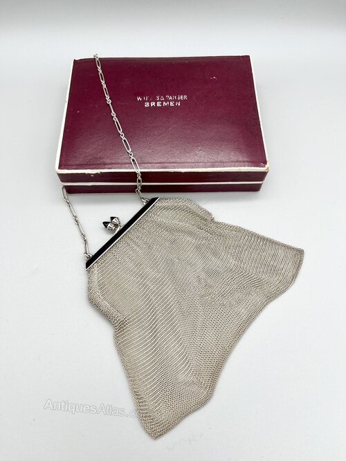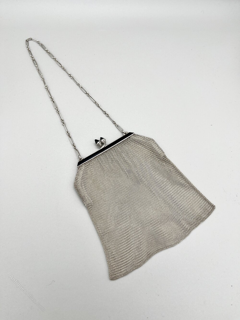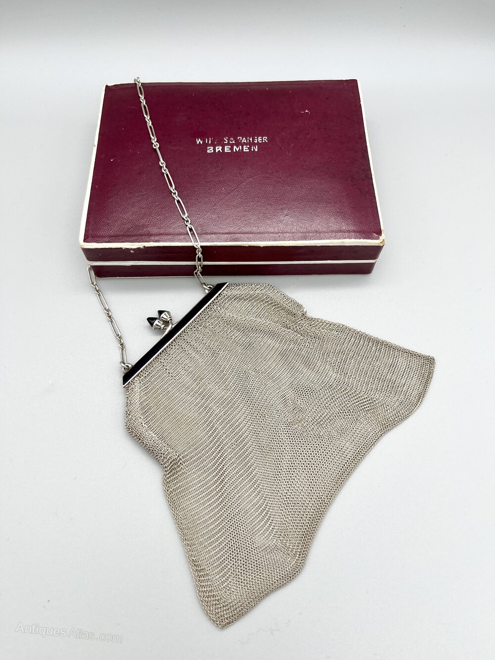 Here we have a very stylish German Art Deco 900 Silver Mesh Evening Bag. The fine mesh bag drapes from a solid silver frame which has black enamel on the outside and on the top of the clasp. There is a Figaro style chain handle.The evening bag was made by or for Wilkens & Danger of Bremen in Germany and dates to around the 1920s/30s. Martin Heinrich Wilkens established his business in Bremen in 1810. He was a goldsmith and silversmith who produced small items and also did repairs. His sons joined the business around 1830 and they expanded and began minting coins for Bremen. In 1862 the youngest son Johannes launched a jewellers and silversmiths shop, Wilkens & Danger, which remained in business into the 21st century.