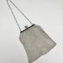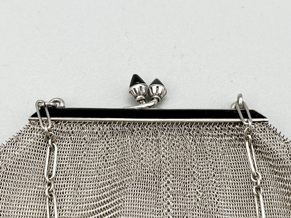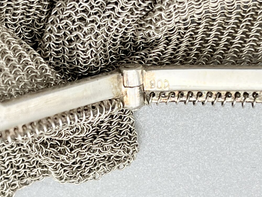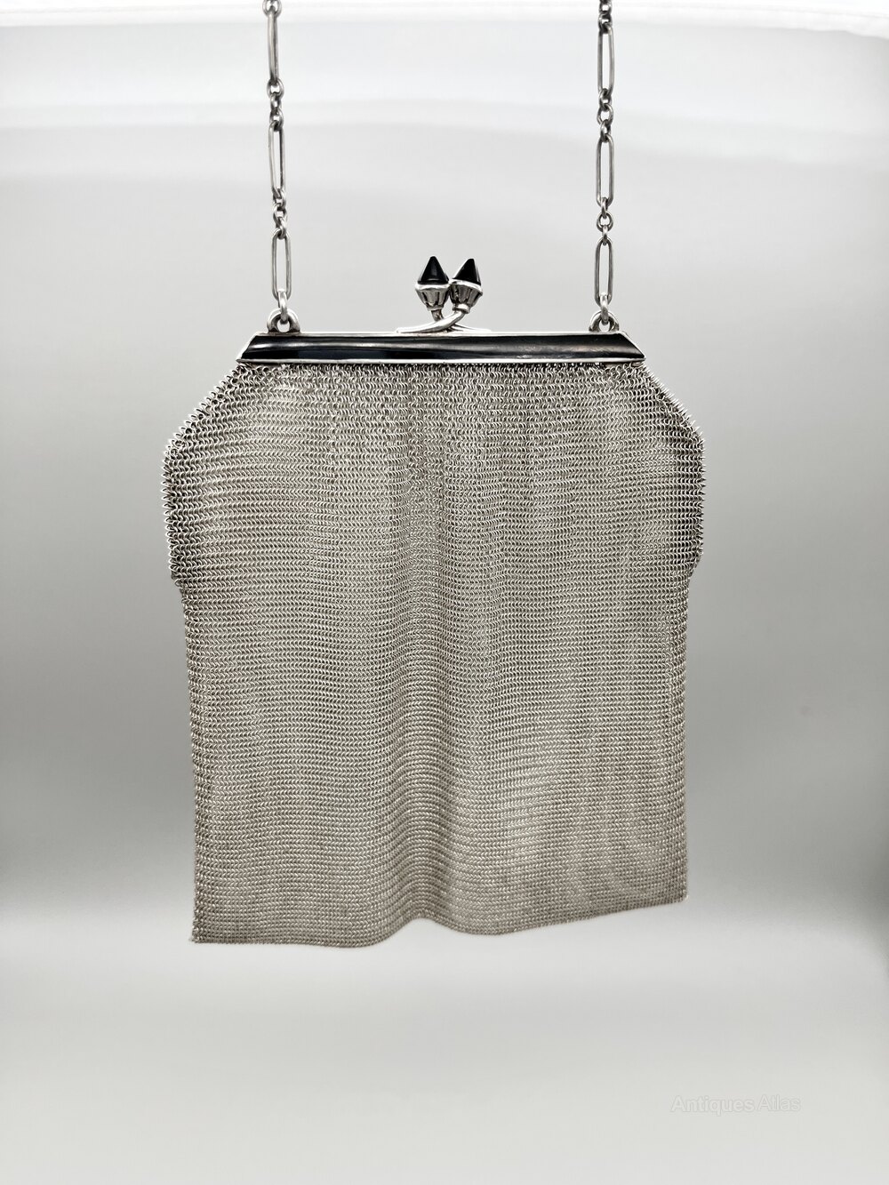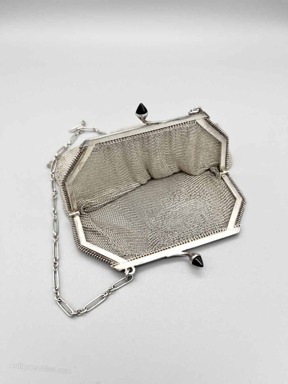 Here we have a very stylish German Art Deco 900 Silver Mesh Evening Bag. The fine mesh bag drapes from a solid silver frame which has black enamel on the outside and on the top of the clasp. There is a Figaro style chain handle.The evening bag was made by or for Wilkens & Danger of Bremen in Germany and dates to around the 1920s/30s. Martin Heinrich Wilkens established his business in Bremen in 1810. He was a goldsmith and silversmith who produced small items and also did repairs. His sons joined the business around 1830 and they expanded and began minting coins for Bremen. In 1862 the youngest son Johannes launched a jewellers and silversmiths shop, Wilkens & Danger, which remained in business into the 21st century.