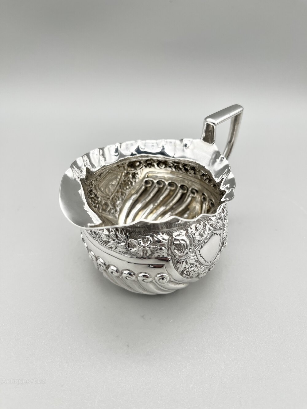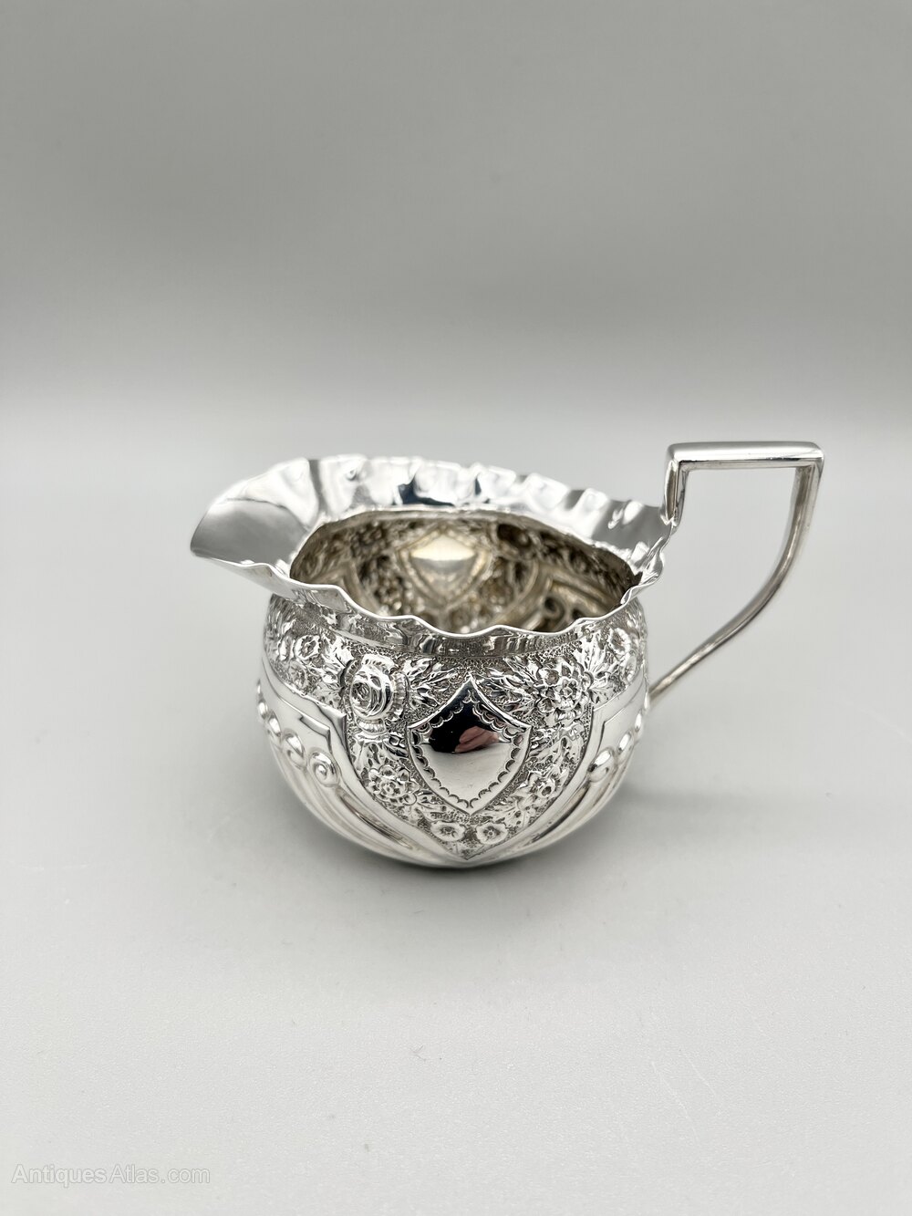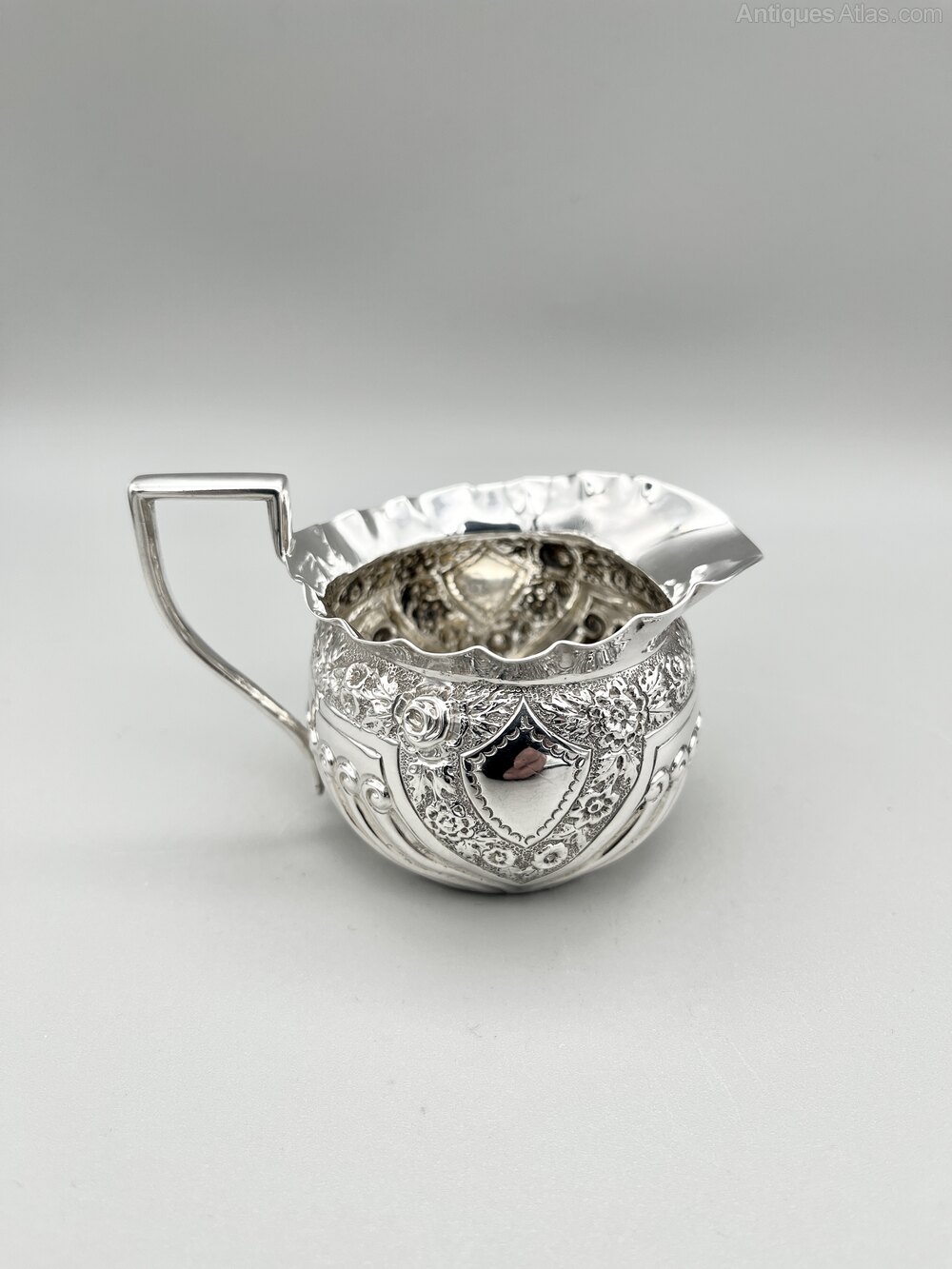 Here we have an ornate late Victorian Sterling Silver Cream Jug. The jug has a flat circular base, part reeded decoration around the body and a band of embossed floral decoration framing a bank shield shaped cartouche on each side. The top rim is crimped.The cream jug was made by Josiah Williams & Co and assayed in London in 1893. Josiah Williams & Co of Bristol were a hugely successful firm of silversmiths, the biggest in England outside of London, Birmingham and Sheffield. They traced their history back to Robert Williams succeeding to the business of William Woodman in around 1838. The firm passed through several generations of the Williams family becoming Josiah Williams & Co in 1879. Later partners included George Jackson and David Fullerton before they became a limited company in 1925. They finally ceased trading around 1940.
