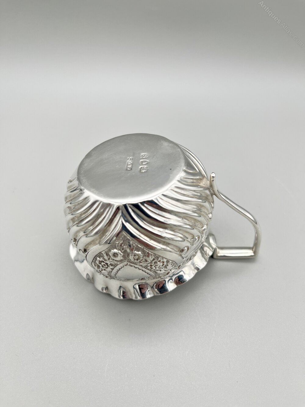 The jug measures 9cm / 3.5ins from lip to handle, 6cm / 2.4ins across the top rim and stands 5.7cm / 2.2ins high. It weighs in at a respectable 51.3g / 1.8oz of solid Sterling Silver.