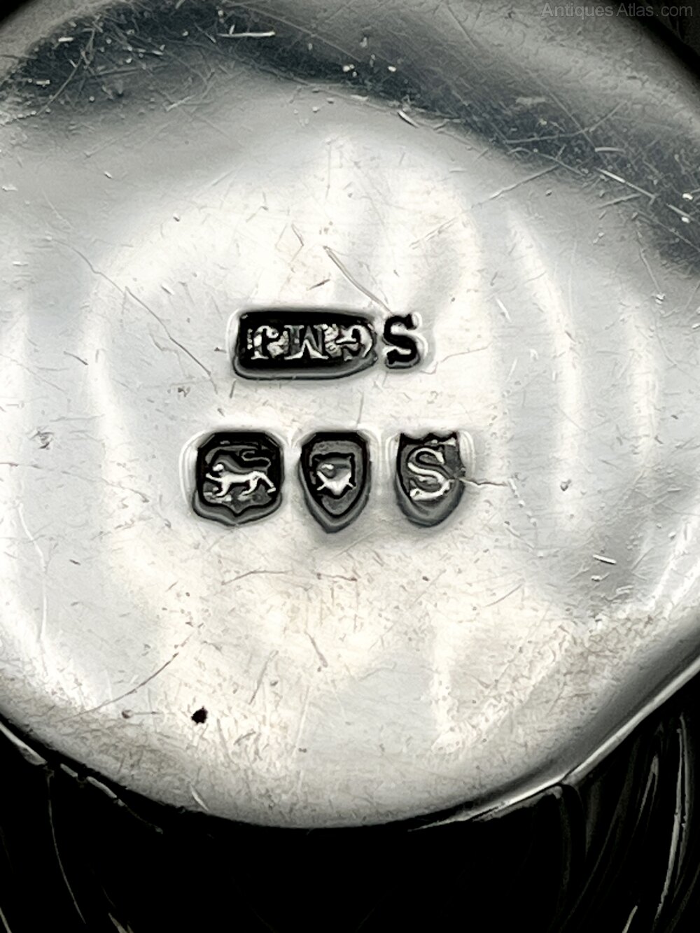 The hallmarks, on the underside of the base, are nice and clear to read. They show the lion passant for Sterling Silver, the leopard's head assay mark for London, the date letter S for 1893 and the G M J makers' mark for George Maudsley Jackson, head of Josiah Williams & Co at this time.