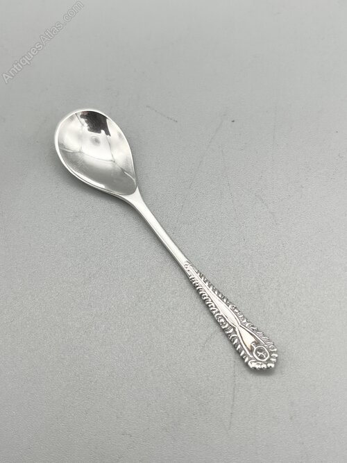 This is an attractive Vintage Sterling Silver Mustard Spoon in the rarely seen Grecian pattern. The upper part of the stem is beaded with a floral drop. There are no initials or personalisation of any kind.The mustard spoon was made in Birmingham for S.J. Rose & Son and dates to 1985. Stephen J Rose founded his company in London in 1921, becoming S.J. Rose & Son in the late 1930s. They had retail premises in London and registered marks in the London, Birmingham and Chester assay offices. They offered a wide range of high quality silverware and remained in business into the 1990s.