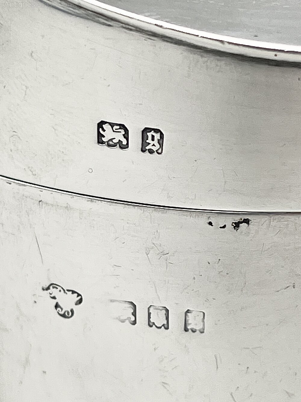 The hallmarks, on the front of the body and the lid, are a little rubbed but still clear to read. They show the lion passant for Sterling Silver, the leopard's head assay mark for London, the date letter g for 1922 and the trefoil style R W B makers' mark for Sir Richard Woodman Burbidge, Chairman of Harrods at this time. In addition the underside of the base has the retail stamp HARRODS.