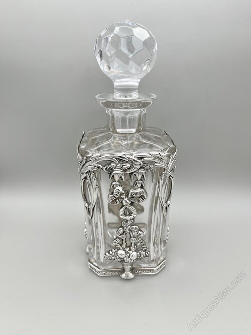 Here we have a beautiful Vintage Cut Crystal Decanter with an ornate Sterling Silver overlay. The square decanter has chamfered corners and a star cut base. The top and neck are faceted as is the spherical stopper. The silver overlay covers all four sides and features flowers and ribbon garlands descending to baskets of fruit. It is a very eyecatching piece.The decanter was made in Portugal and assayed in the city of Porto in the late 1980s or early 1990s. There is a very small makers' mark on the silver but we have not as yet been able to identify it.