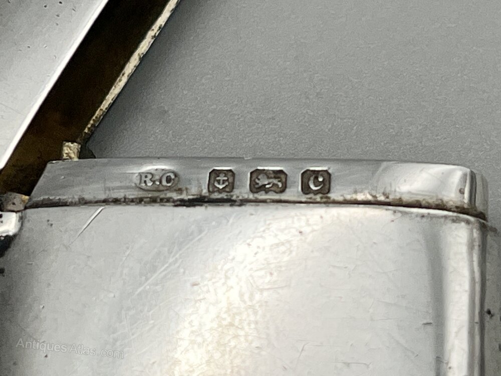The hallmarks, on the inside rim of the body, are well struck and clear to read. They show the lion passant for Sterling Silver, the anchor assay mark for Birmingham, the date letter c for 1902 and the R.C makers' mark for Robert Chandler.