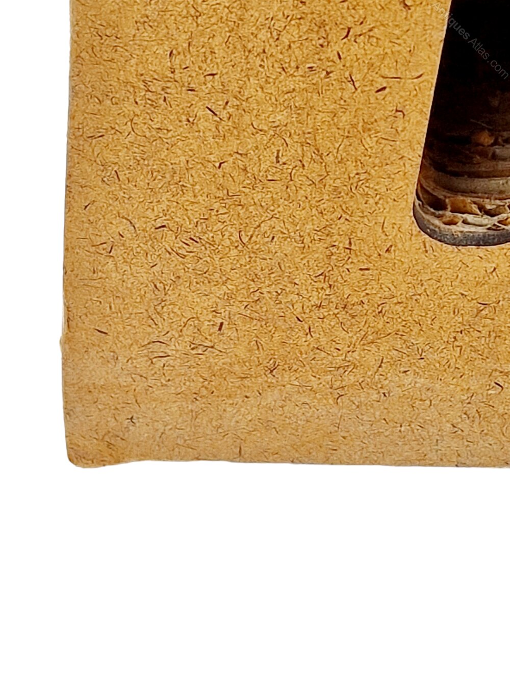 In excellent condition commensurate with its age and use. There are some watermarks and marks on the hard fibre board edges as photographed. The hard fibre board at the base of one of the back legs has been creased very slightly. The base of the front of the chair has a very small area that has been push in slightly. The cardboard has also been very slightly parted on the underneath of the back legs. Please see photographs.