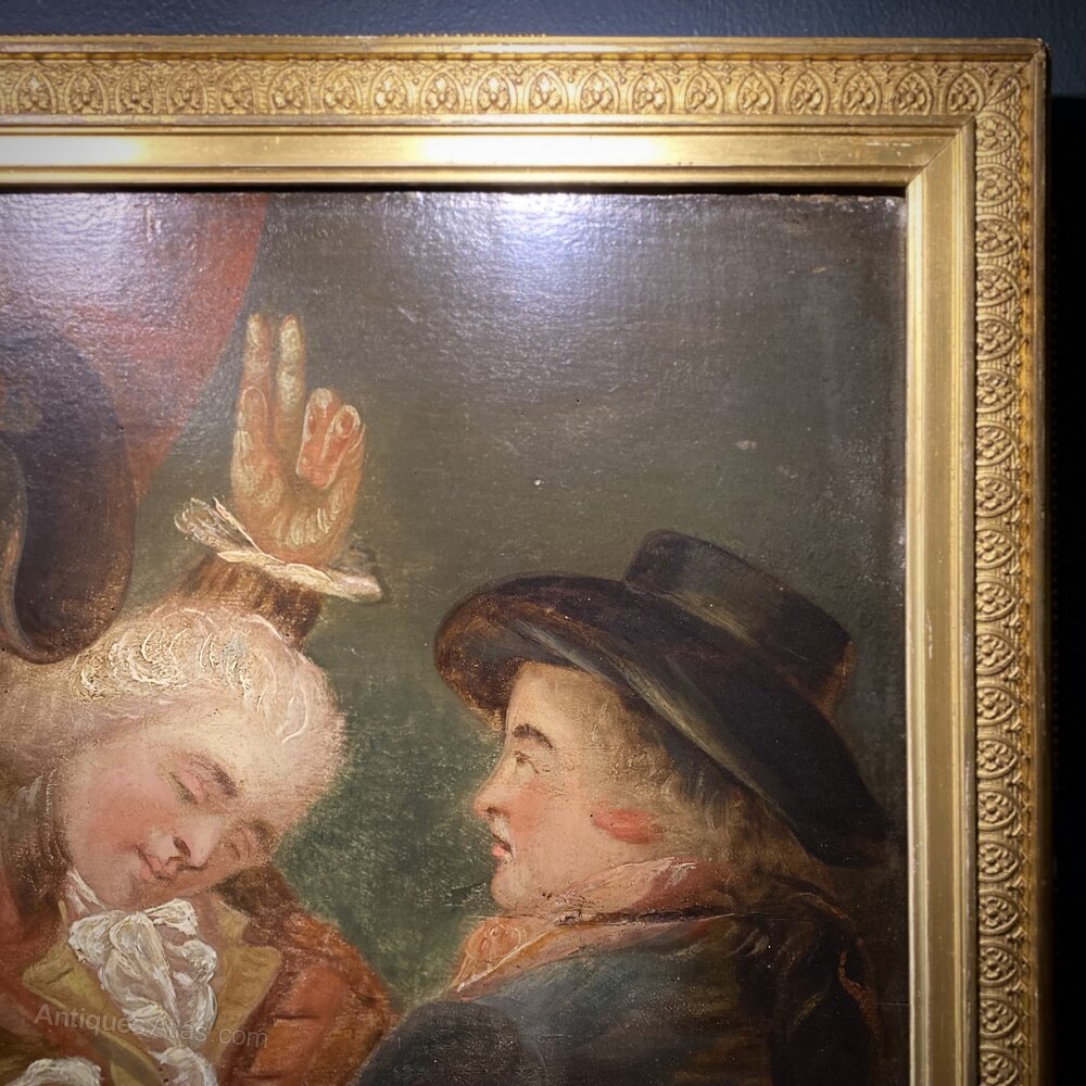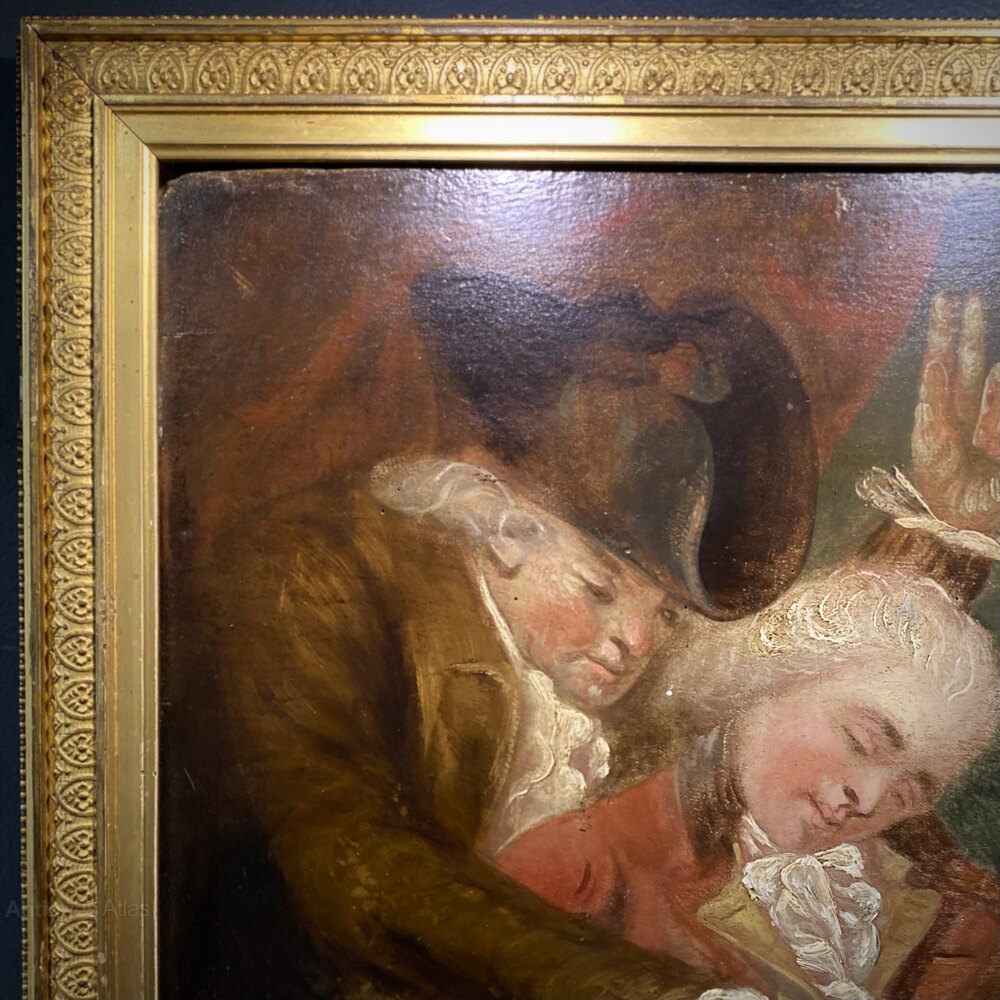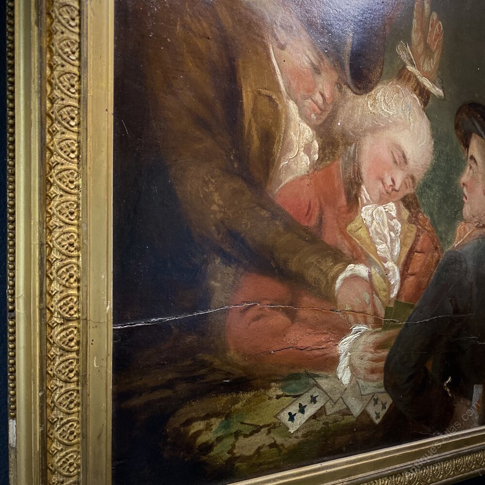 A charming early Georgian portrait of three Georgian Gentlemen sat at a table, having a dandy time playing cards.This very attractive smaller scale painting sits within a gilt frame, showing signs of wear commensurate with the age of the piece. There are some signs of wear to the panel too, which have already been treated as a precautionary measure.