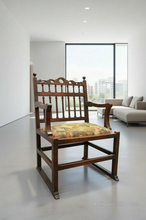 Lovely 18th Century Oak 'Westmoreland' Lawn ChairThis chair has a two tier back each with turned vertical spindles and pierced shaped top rail. Two curved arm supports, four square legs united by stretchers and lawn rails.