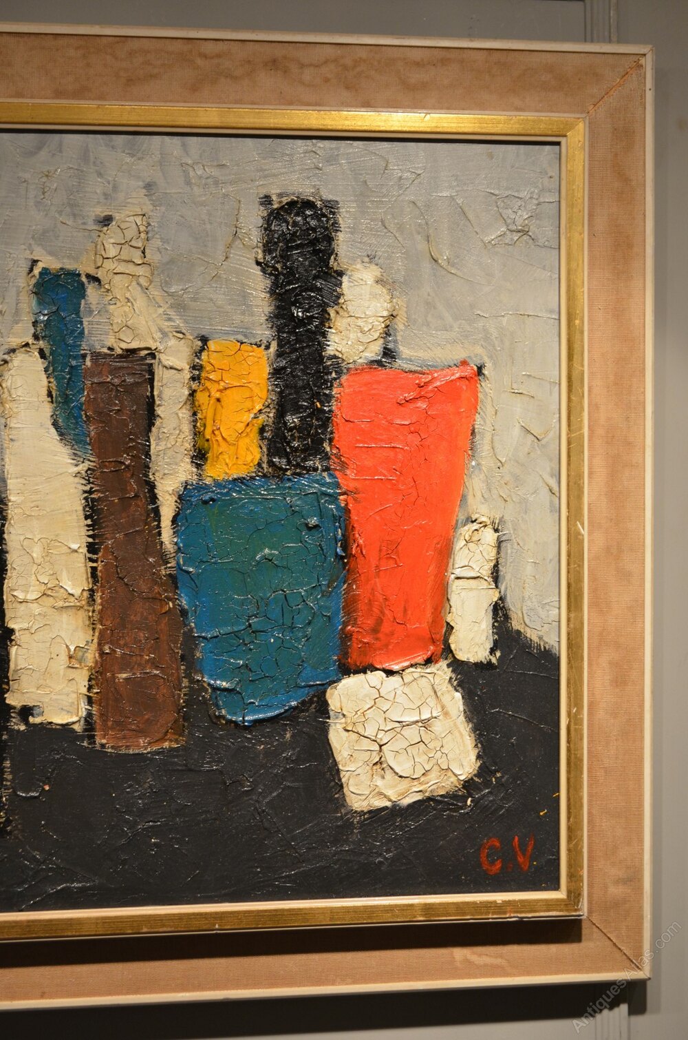 Decorative bold Colourful Still Life of bottles initialled CV on bottom right of painting.This Oil on board would brighten up the home and dates from post war.