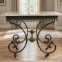 Round disc motifs further enhance the scrolls. The table legs rest on four iron casters.