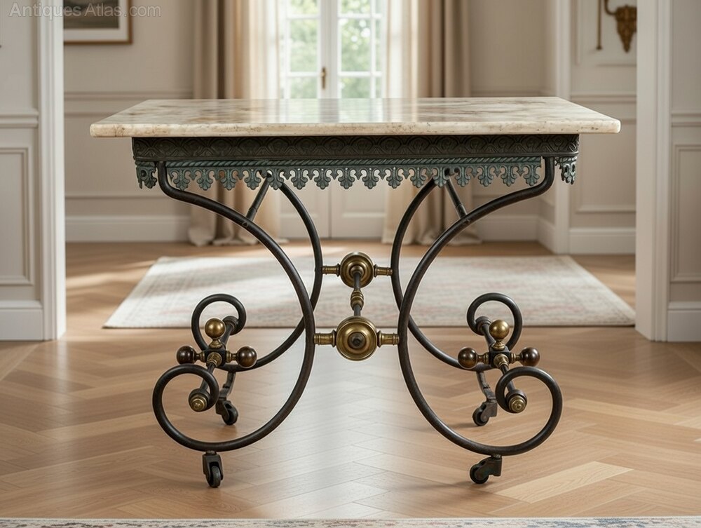 Beautiful decorative French Bakers Marble Topped TableThis original French 19th century pastry or butcher's display table is a fine example that retains its original marble top and all its burnished brass finials.
