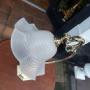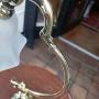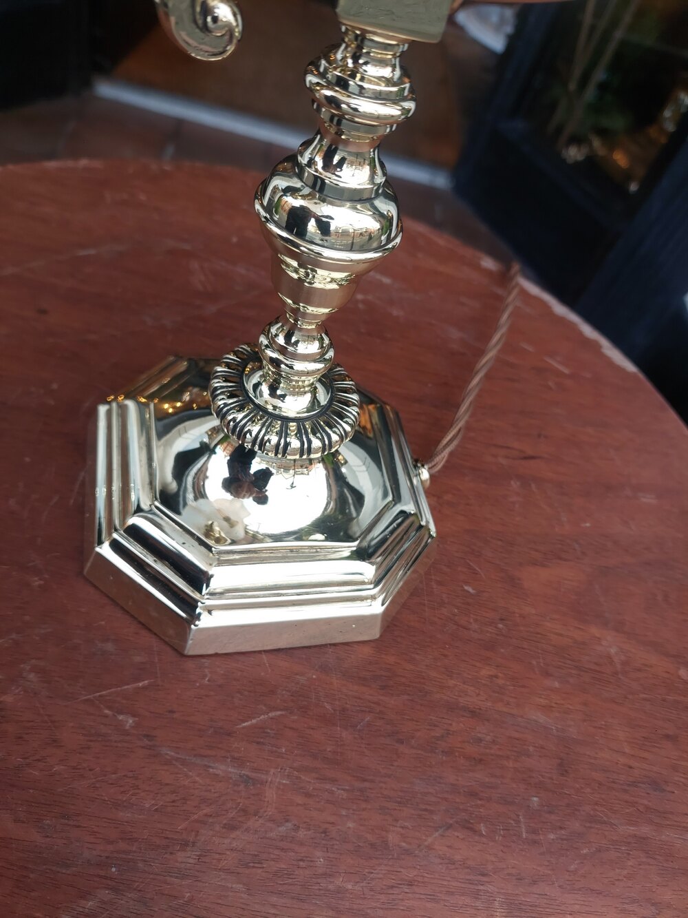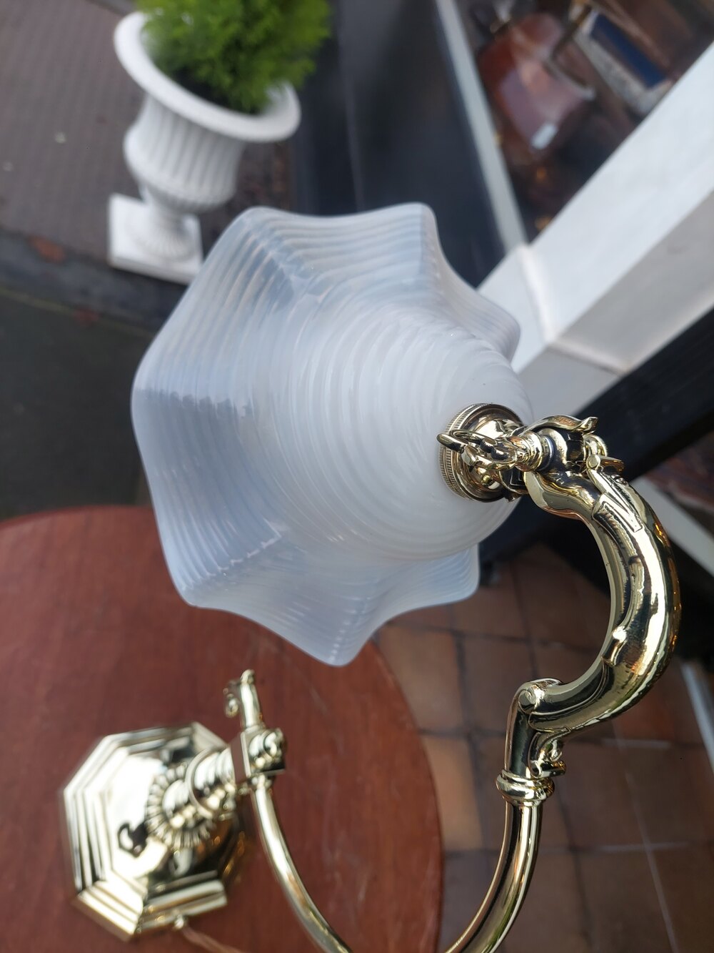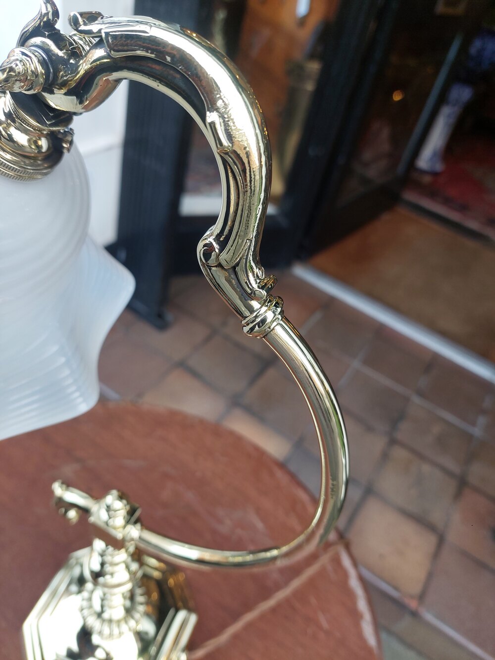 Early 20thC Brass Desk Table Lamp with adjustable Milk Glass Shade - 12"w x 7"d x 17"h - all lights and lamps have been rewired with authentic corded flex, fitted with either foot switch or finger clicker switch and are Pat testedDateEarly 20th Century