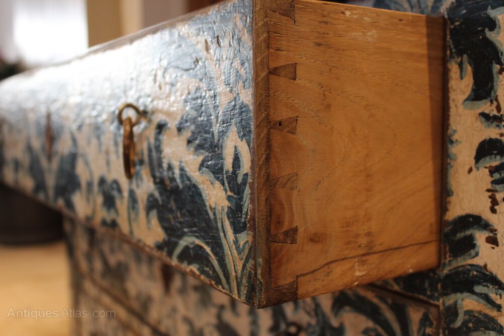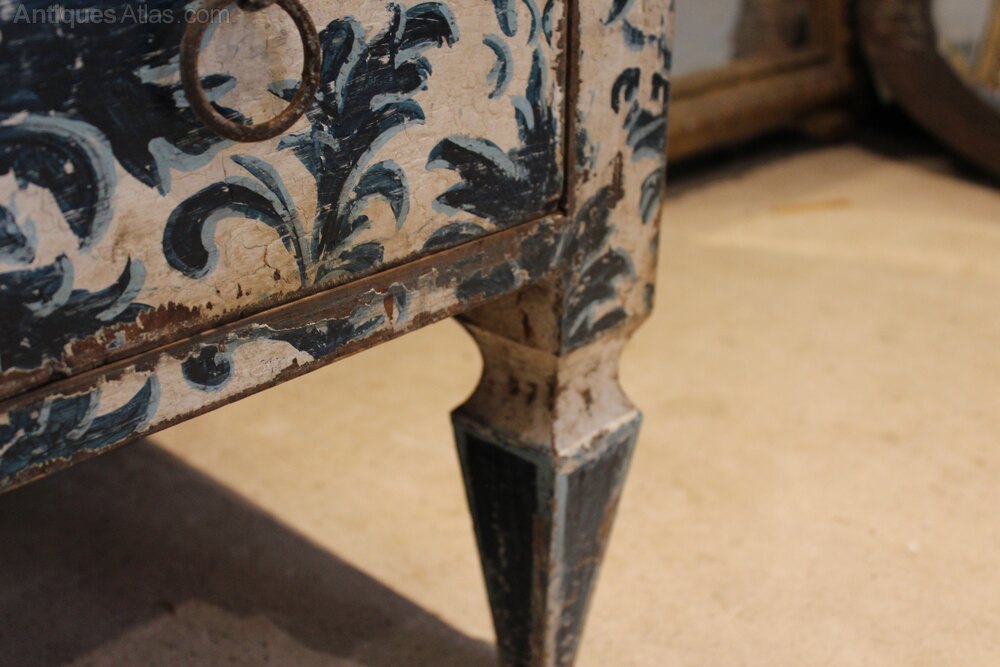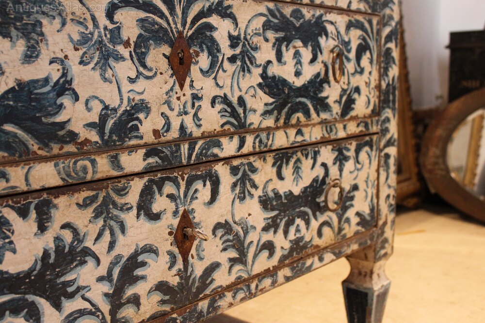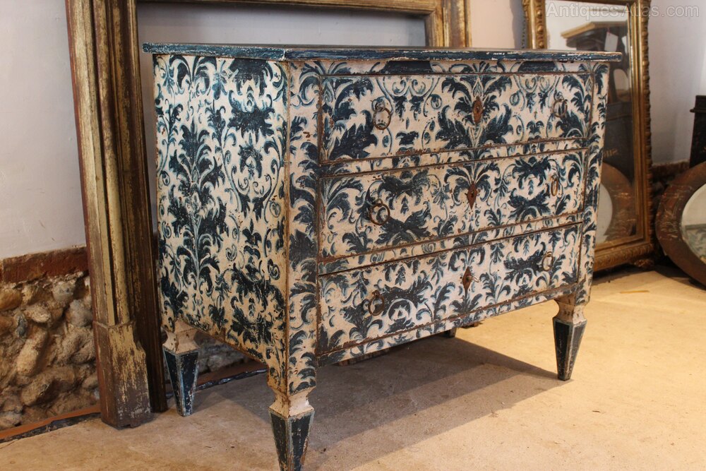 Here we have a stunning neo classical period Italian Chestnut chest of drawers or commode c1760. As you can see the chest has the most delicious painted finish with outstanding Baroque design. The paint is rich deep Blue and off White which gently bleeds into each other to give the most remarkable design and is a real show stopper. The chest is of great quality being made from solid Chestnut and having three long drawers with hand cut dove tail joints and super angled reverse obelisk legs. A fantastic period chest in great retail condition ready for your home. The dimensions are approx 104 cm wide 52 cm deep 86 cm high.Buy from a trusted LAPADA dealer