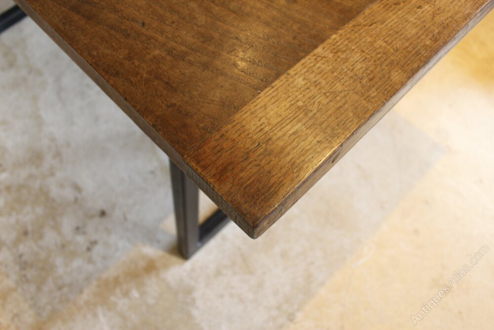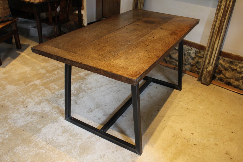 Here we have a stunning George III Oak table top c1790 on a bespoke made box steel base . As you can see the Oak has beautiful colour and patina. The top has three thick planks and cleated ends. The fantastic base designed in house is made from box steel and beautifully welded. The base gives the table a floating top feel. It is designed so that there is nothing in the way of your legs without compromising on strength and solidity. A truly unique table mixing the old and the new. The table will comforbaly seat 6 and is in great retail condition ready for your home. The dimensions are approx 150 cm long 76 cm deep 77 cm high.Buy from a trusted LAPADA dealer