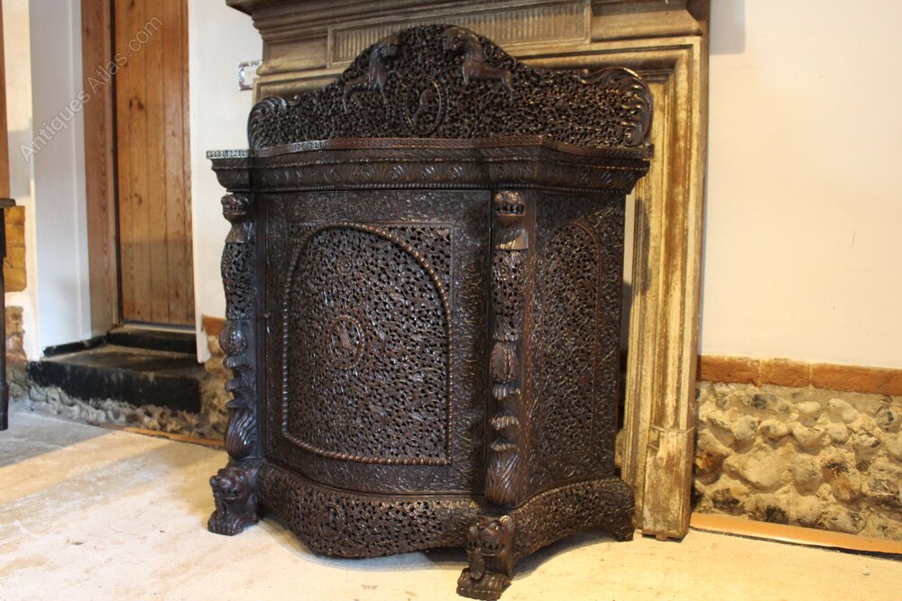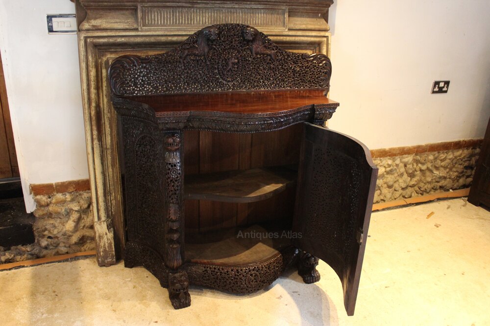 Here we have an outstanding Victorian period Burmese Padauk wood cupboard or cabinet c1880. The cupboard has rich and beautiful colour and patina. This is the most exquisitely carved piece of this type we have had. There is a gallery top pierced, carved and well shaped. The cabinet has a stunning swept serpentine shape and is carved on every piece apart from the top which is richly coloured in the only way Burmese Padauk can be. An absolute exhibition quality cabinet in great retail condition ready for your home. The dimensions are approx 107 cm wide 115 cm high 42 cm deep.Buy from a trusted LAPADA dealer