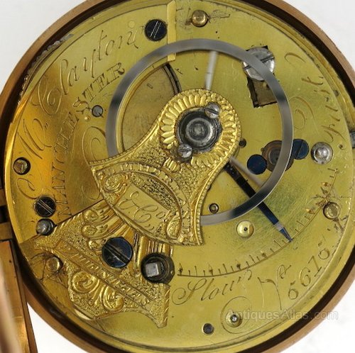MOVEMENT : Gilt rack lever movement, with engraved balance cock, diamond endstone, polished steel escape wheel, four round pillars, and blued screws. Signed (M. Clayton, MANCHESTER) and numbered (5615).