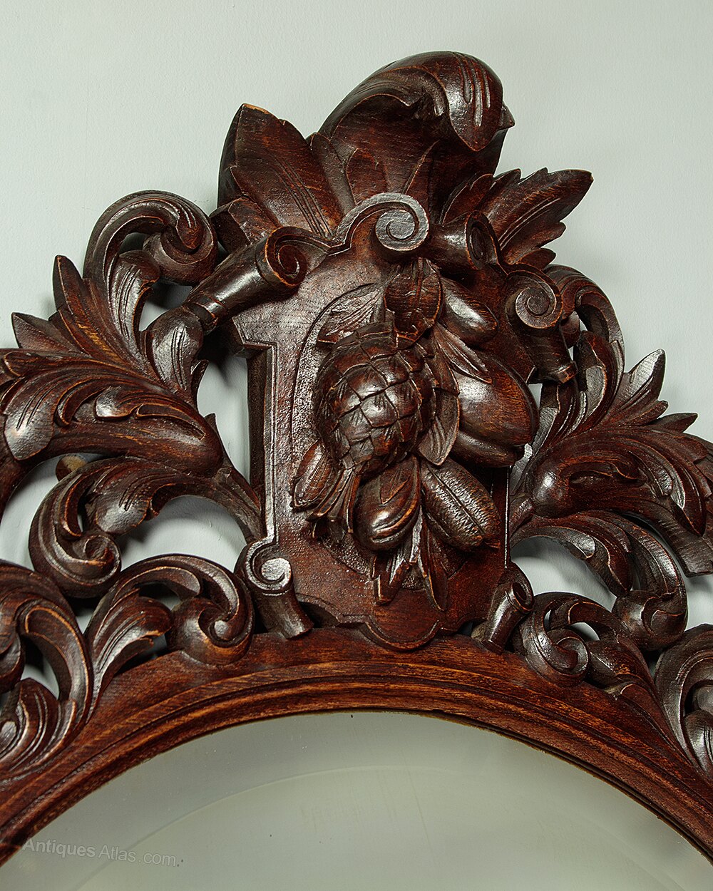 Impressive late 19th.c. carved oak wall mirror c.1890. Original 29" x 39½" mirror plate with a bevelled edge. Within a superb carved and pierced oak frame with scrolling acanthus leaves and topped with fruit against a scrolling cartouche. Some obvious shading to the mirror (could be replaced if preferred) otherwise very good condition, cleaned and waxed in our workshops.Width: 39.5" (100.5 cm)