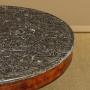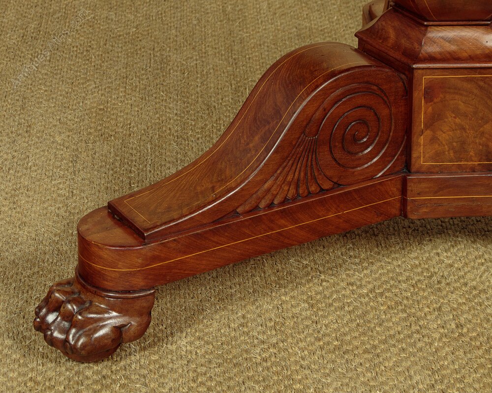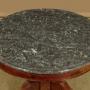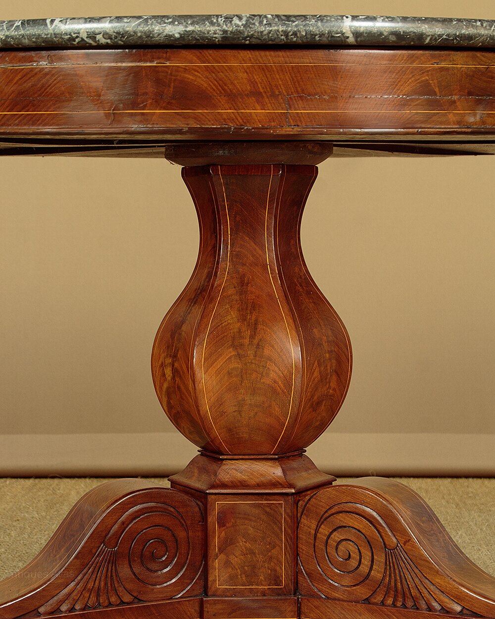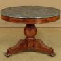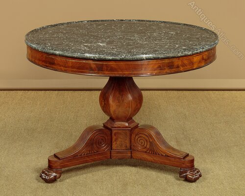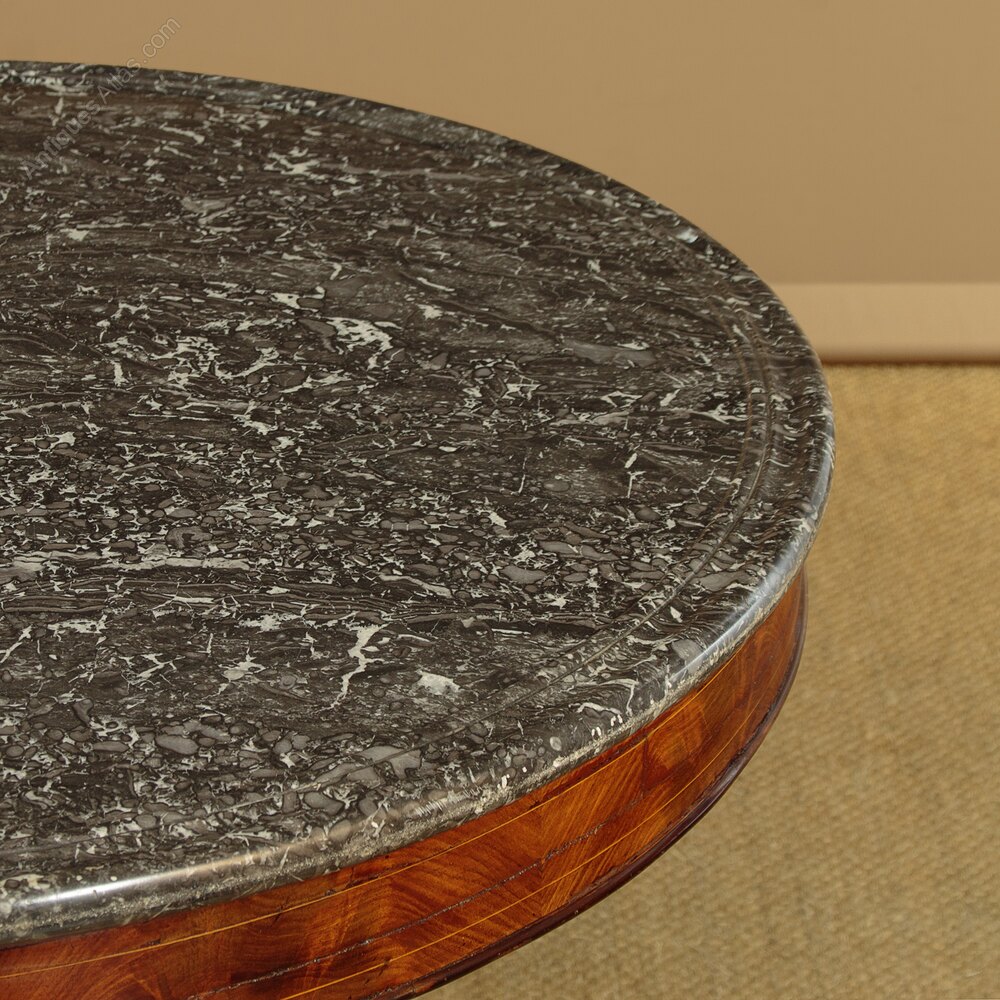 Handsome mid 19th.c. French marble top gueridon or centre table c.1860. Very well figured grey marble top (38" diameter) with raised moulded edge of concentric rings designed to stop spilt liquids from running over the sides. Walnut veneered apron with inlaid satinwood stringing. Bulbous hexagonal pedestal and tripod base with matched walnut veneers, also inlaid and with crisp scroll carved detail. Raised on carved claw feet. Wear and repairs to the veneers on the apron, otherwise excellent colour and condition. Cleaned and waxed in our workshops.Height: 28.5" (72.5 cm)