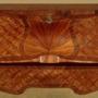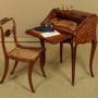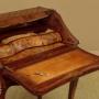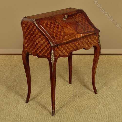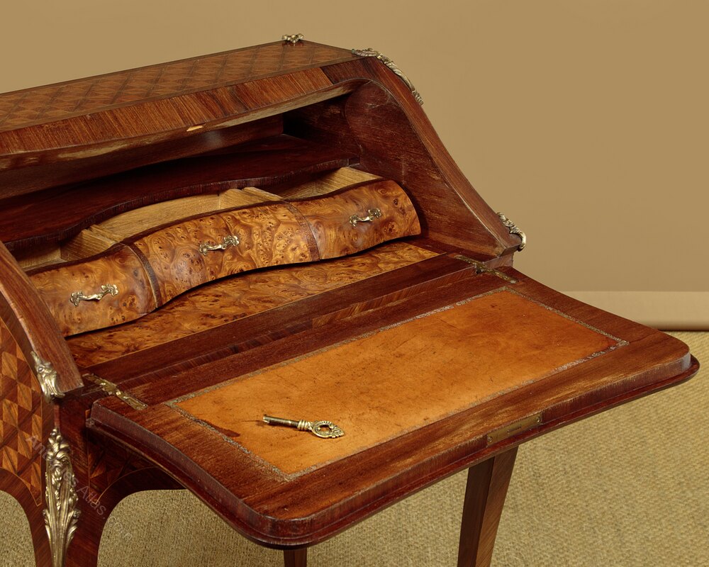 Fine quality little Louis XV style French bombé bureau or writing desk c.1960. Just 28" wide. Open the fall to reveal a leather writing surface and fitted interior with a shelf and three small drawers with shaped fronts in highly figured burr elm. The base of the interior, also in burr elm, slides open to allow access to the space below. Superb parquetry work decoration in contrasting mahogany and rosewood with inlaid stringing across the top, front and sides of the exterior. Good quality brass mounts to the corners of the bureau and at the top of the front legs. Brass escutcheon and handles inside. Shaped apron to all sides and slim curving legs with brass mounts to the feet front and rear. Excellent colour and condition. Key supplied.Width: 28" (71 cm)