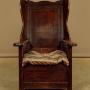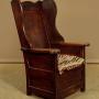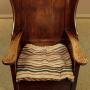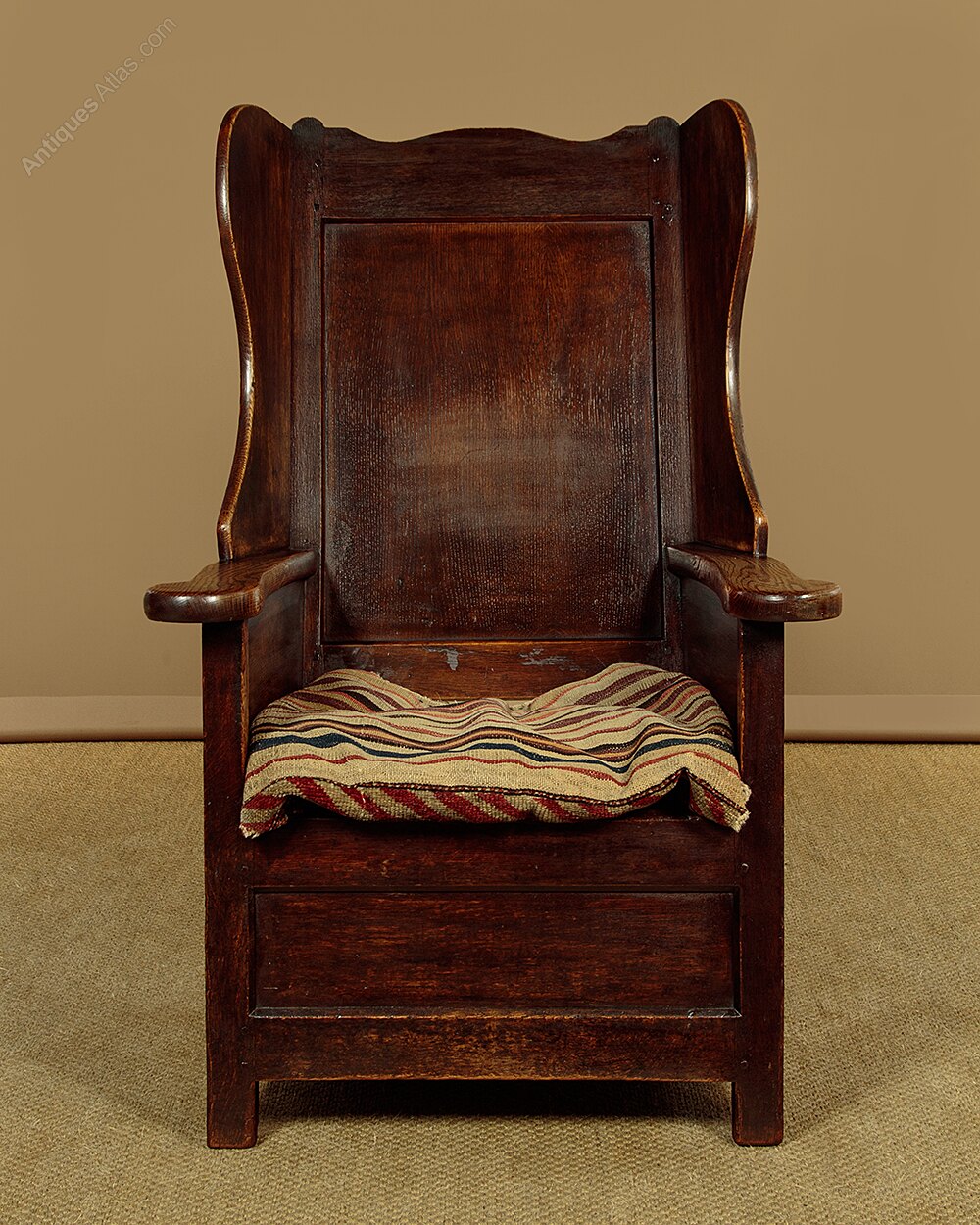 Early 19th.c. oak wing armchair or 'lambing' chair c.1810. High panelled backrest with a shaped cresting rail and the short angled wings typical of the form. The broad flat-top arms with rounded terminals are also a typical feature, providing a useful surface for a drink, a plate or candle. Whilst the sides are enclosed to prevent draughts. Later webbed seat with a loose cushion in a rustic course woven cloth with simple striped pattern, a square of Persian carpet to the other side. Very good colour and condition, cleaned and waxed in our workshops.Width: 29" (73.5 cm)
