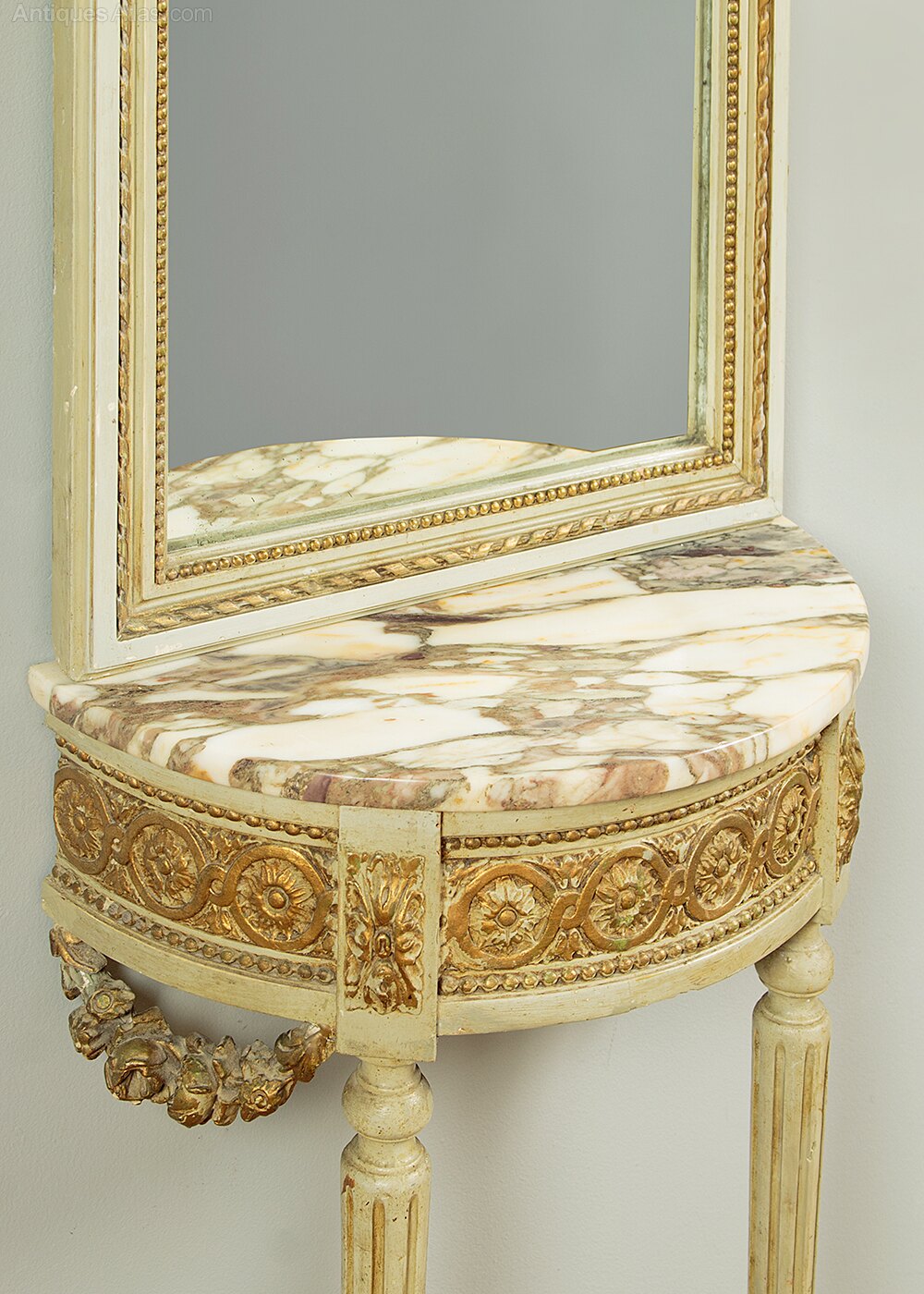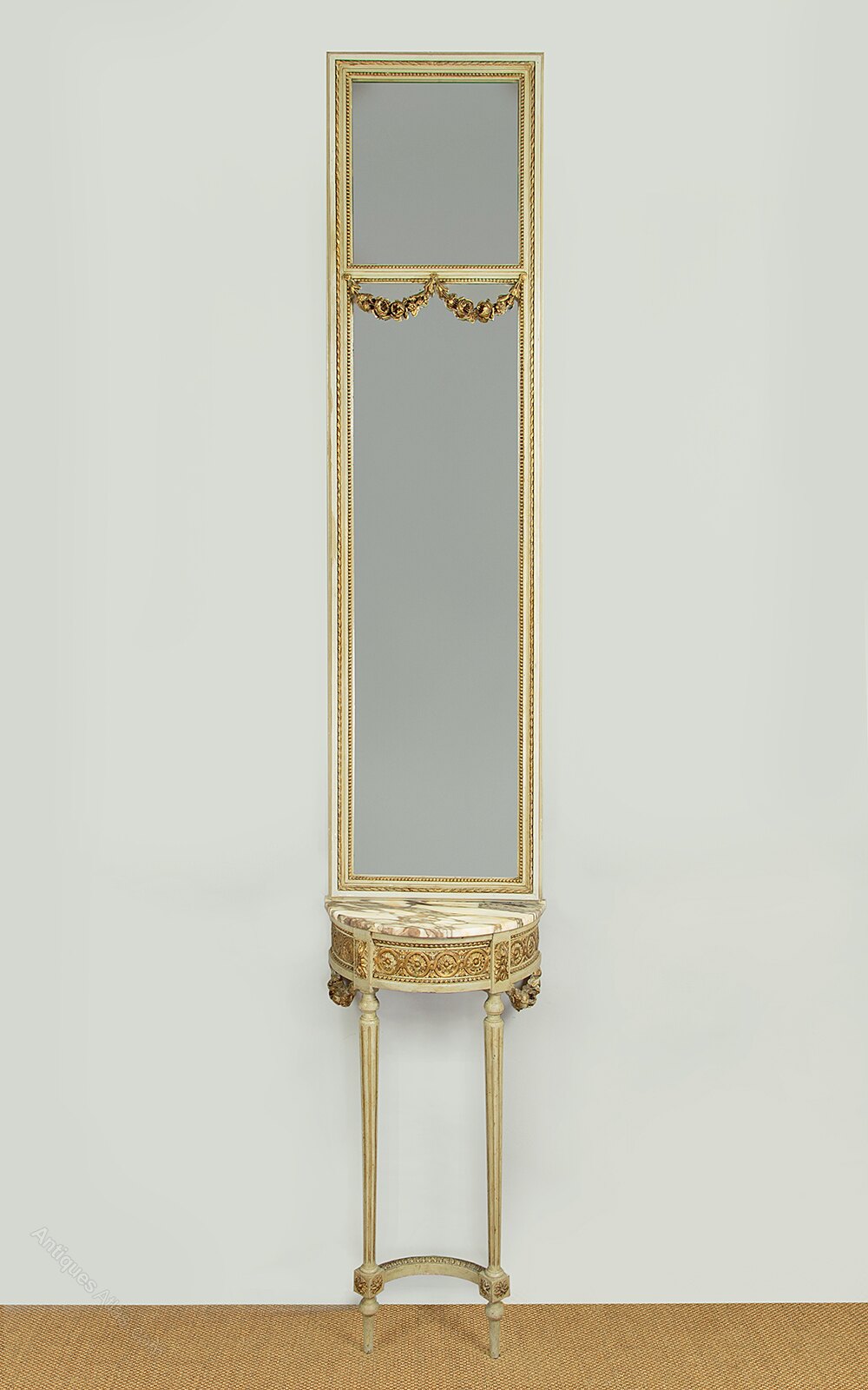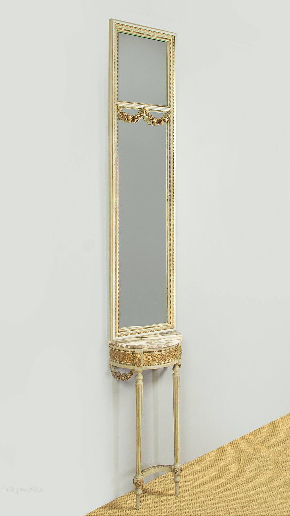 Unusually tall and narrow 'pencil' console table and mirror c.1930. Slim mirror with two plates within a carved frame painted a pale green/grey with gilded detail and featuring carved wooden floral swags across the top of the lower plate. The mirror stands on a half moon shaped marble top console table (just 16½" wide) painted to match and with a guilloche carved frieze, tapering turned and reeded legs joined with a turned stretcher and with carved floral swags to the sides. Some spots of tarnish to the mirror plate, otherwise good condition, cleaned and waxed in our workshops.Width: 16.5" (42 cm)
