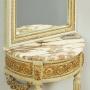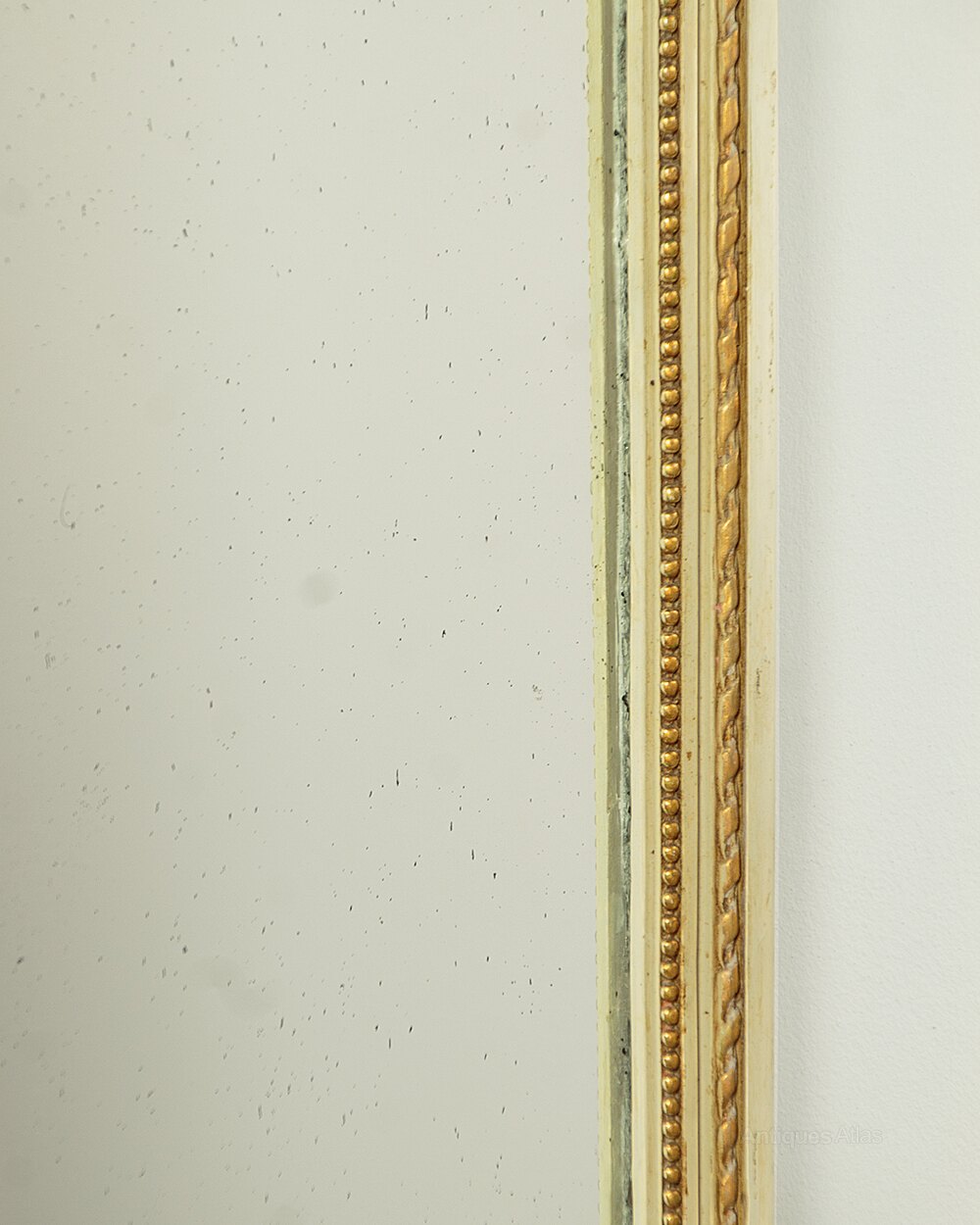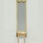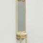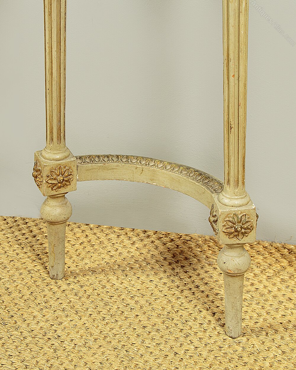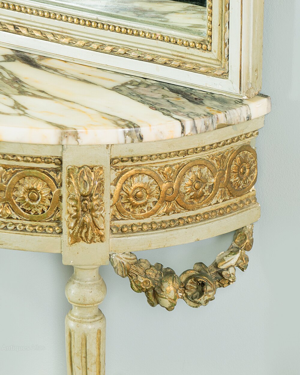 Unusually tall and narrow 'pencil' console table and mirror c.1930. Slim mirror with two plates within a carved frame painted a pale green/grey with gilded detail and featuring carved wooden floral swags across the top of the lower plate. The mirror stands on a half moon shaped marble top console table (just 16½" wide) painted to match and with a guilloche carved frieze, tapering turned and reeded legs joined with a turned stretcher and with carved floral swags to the sides. Some spots of tarnish to the mirror plate, otherwise good condition, cleaned and waxed in our workshops.Width: 16.5" (42 cm)