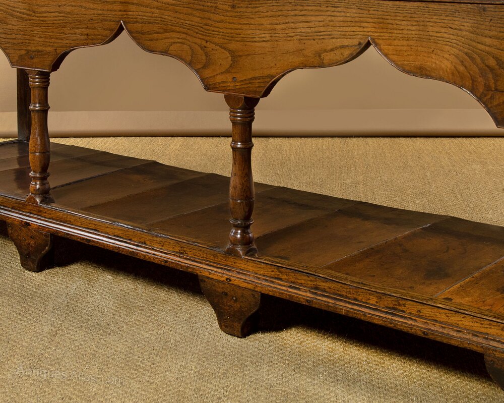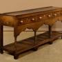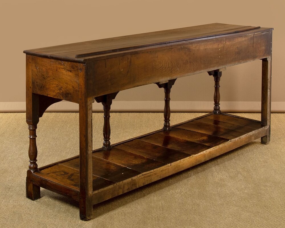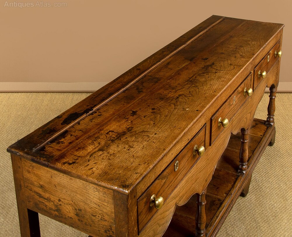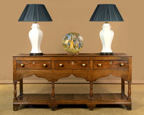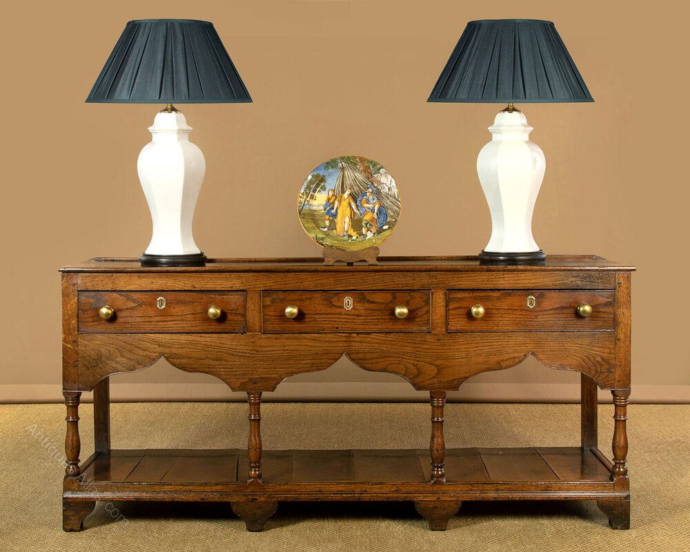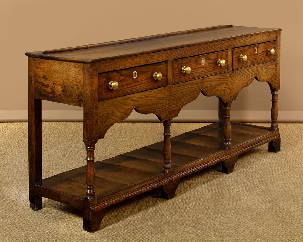 Beautiful 18th.c. oak Welsh potboard dresser base, Montgomeryshire c.1780. Two plank top with an applied bead to form a plate stand (could be removed if preferred) over three drawers. Cockbeaded drawer fronts with brass knobs, heavy oak drawer linings. Lovely ogee arch shaped apron below the drawers, also with a cockbeaded edge. Raised on short turned column front legs joined with a low potboard display shelf with the original oak boards running front to back. Moulded trim and bracket feet to the front. Oak sides and back board. Particularly good colour and grain to the timbers. Excellent condition, cleaned and waxed in our workshops.Width: 66" (167.5 cm)