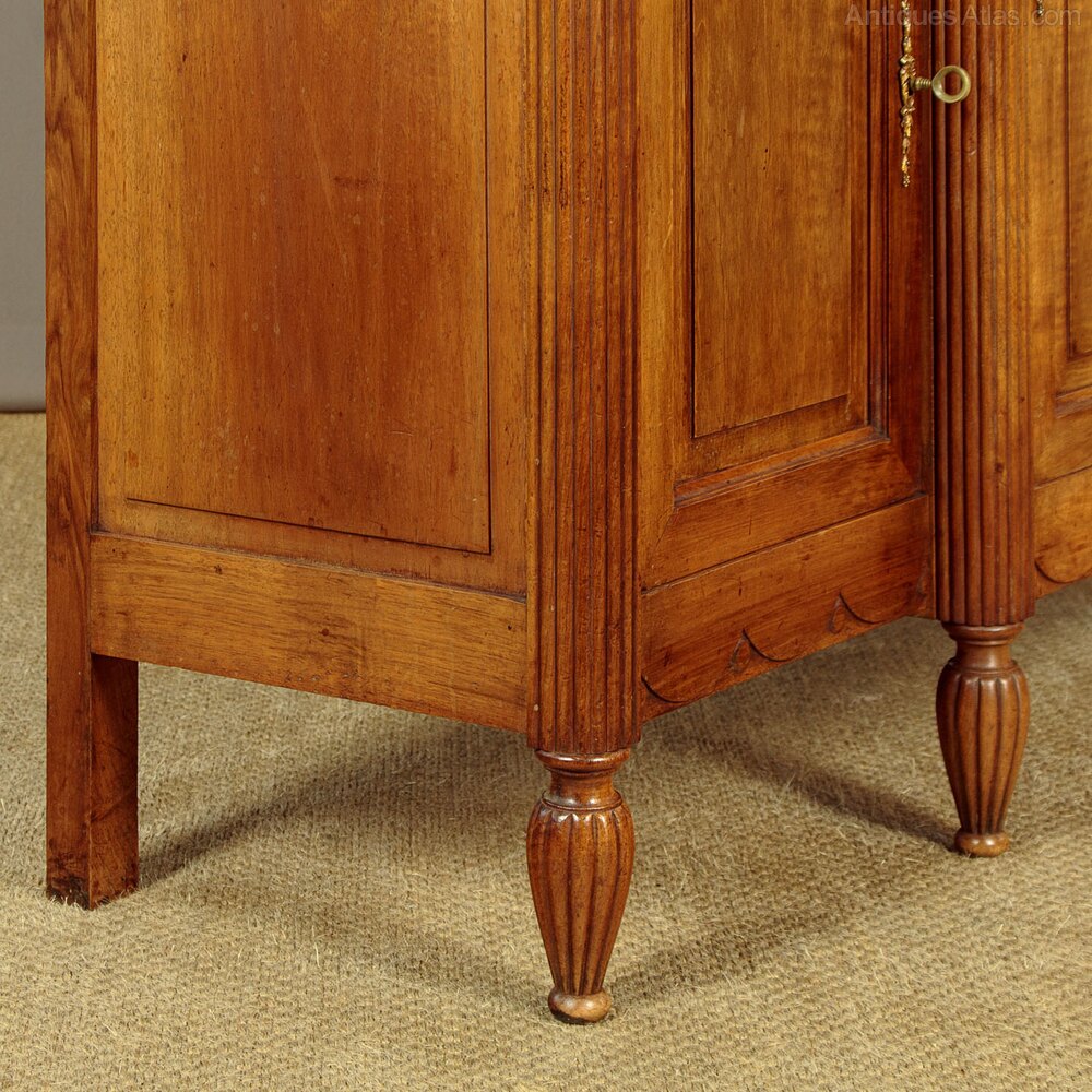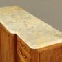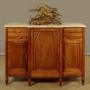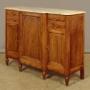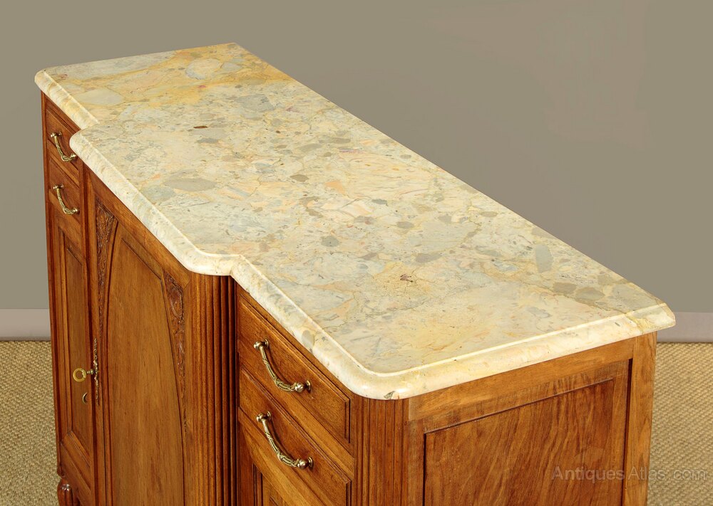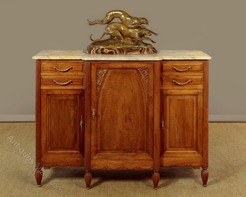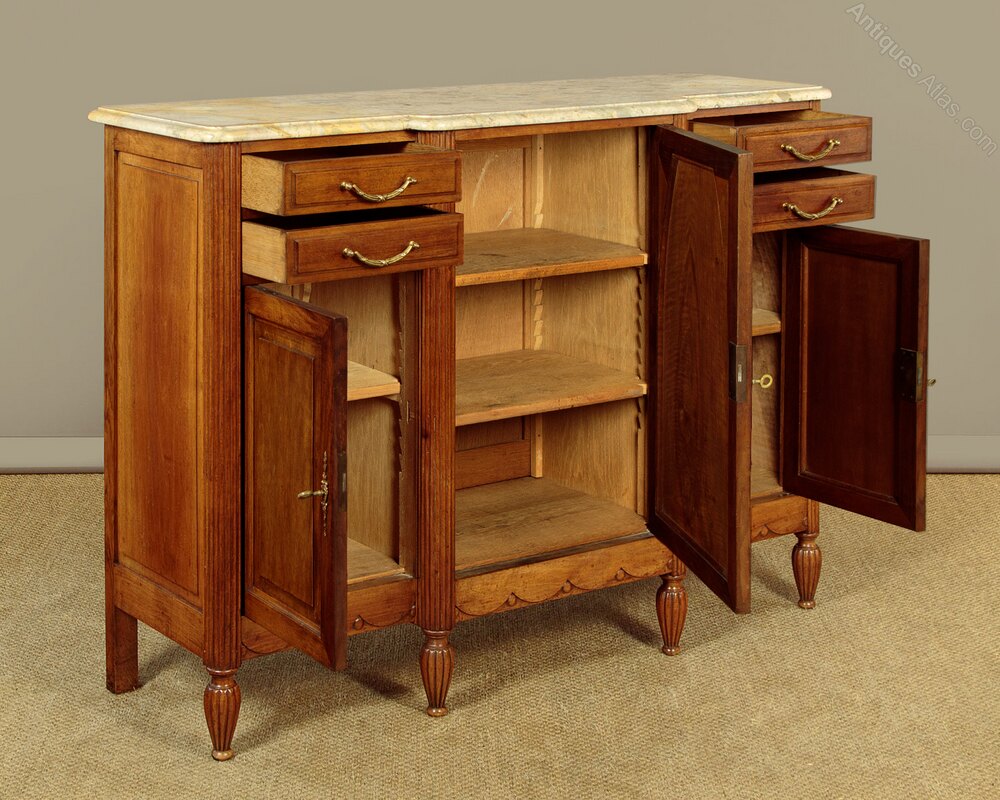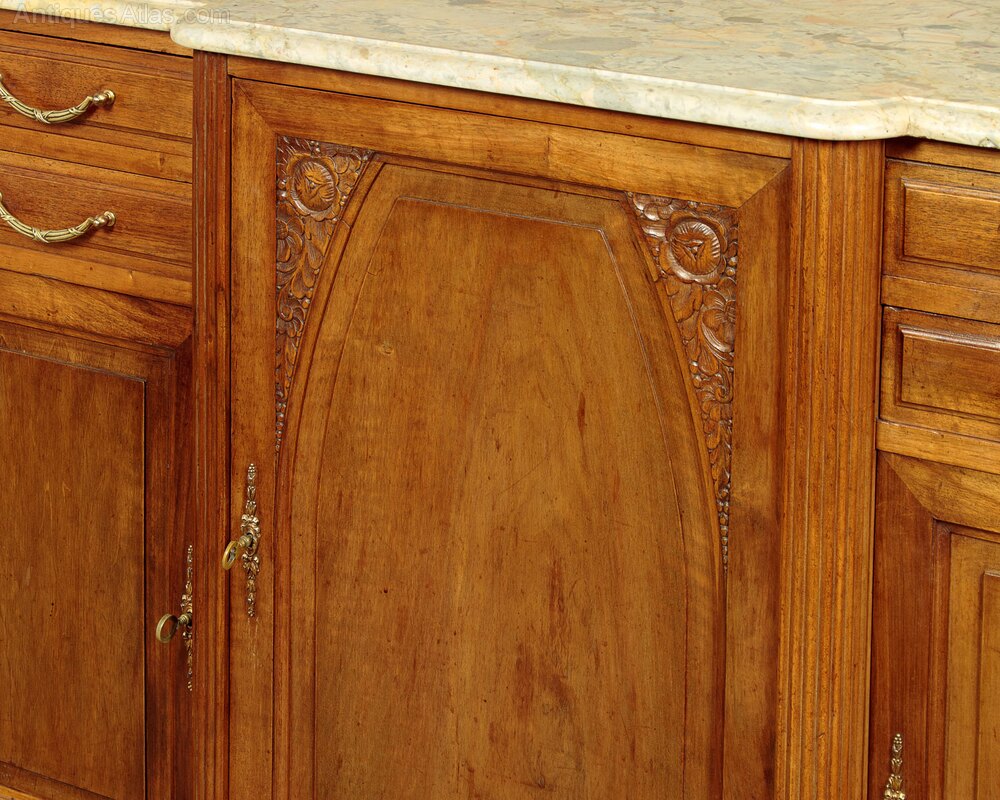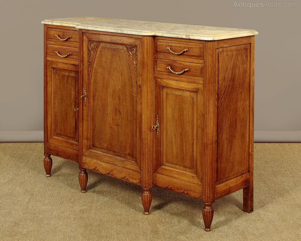 Good looking little Art Deco marble top and walnut breakfront sideboard c.1925. Original and well figured marble top with a shaped and moulded edge. Over a full height central cupboard fitted with two adjustable shelves (internal depth 14½") flanked with two drawers and a shallower cupboard (internal depth 13") on both sides. Carved stylised floral spandrels to the top corners of the main door panel, moulded drawer fronts with original brass handles, raised and fielded door panels with decorative brass escutcheons. Unusual reeded uprights flanking the doors and a shaped and carved apron to bottom edge of the front. Raised on lovely little turned and reeded feet. Solid walnut side panels, oak drawer linings and back panels. Pitting to the to the surface of the marble at the right hand end. Otherwise excellent colour and condition, cleaned and waxed in our workshops. Three original keys supplied.Width: 51" (129.5 cm)