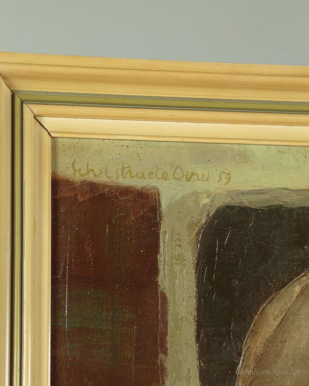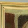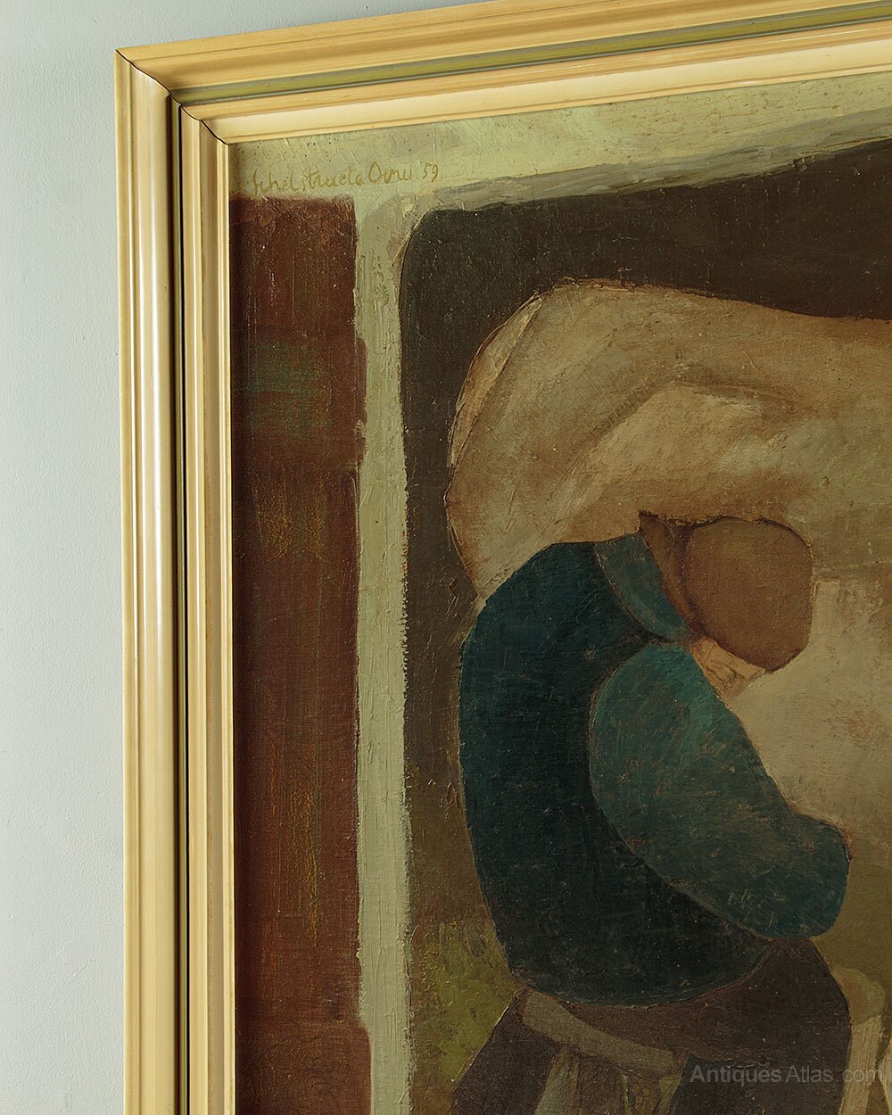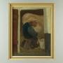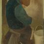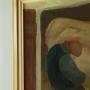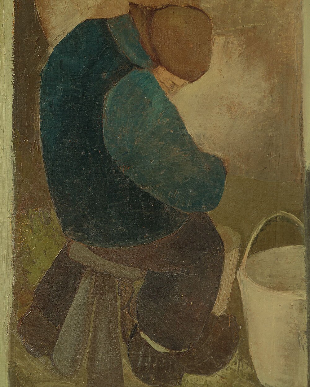 Mid 20th.c. oil paining on board dated 1959. Seen through the open door of a cow shed a figure sat on a three legged stool and wearing heavy wooden clogs milks a pale brown cow. Painted in muted colours in a primitive modernist style rather reminiscent of the works of LS Lowry. Artist is unknown but signed 'Schelstraete' in the top left hand corner of the painting and dated '59. Presented as found in a moulded and painted wooden frame.Width: 31.5" (80 cm)