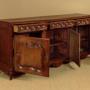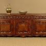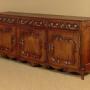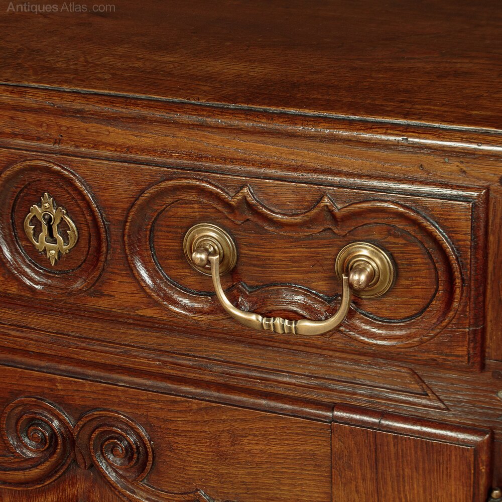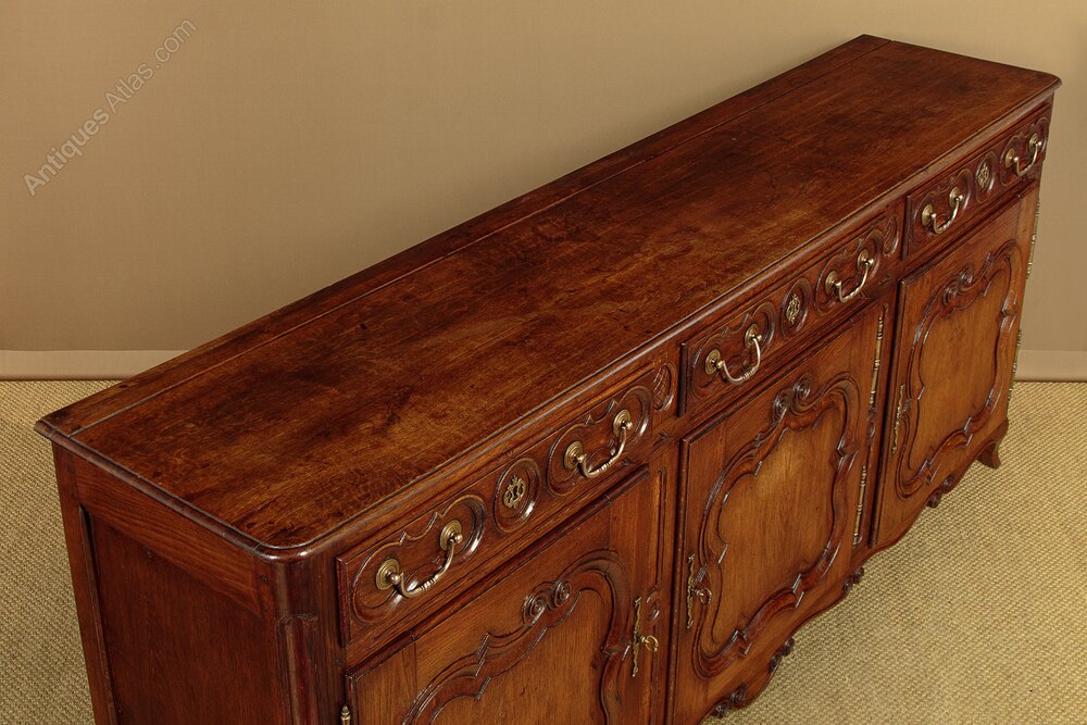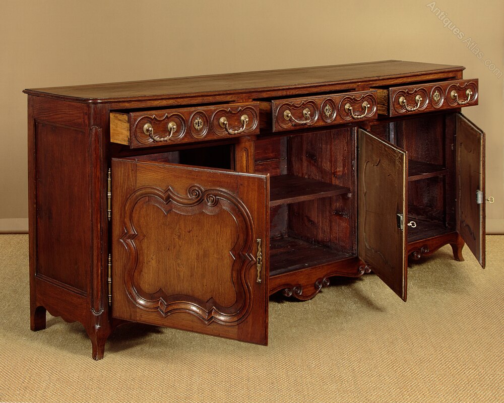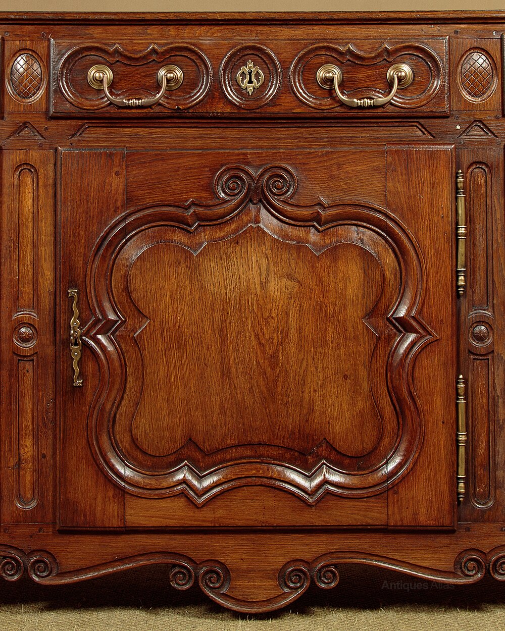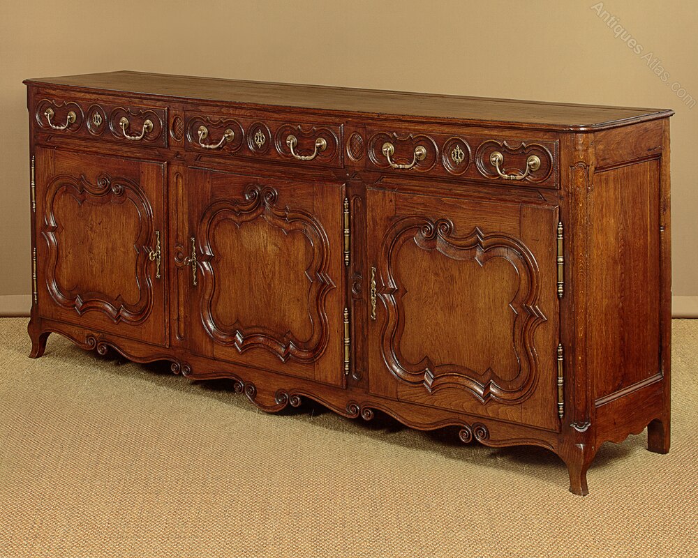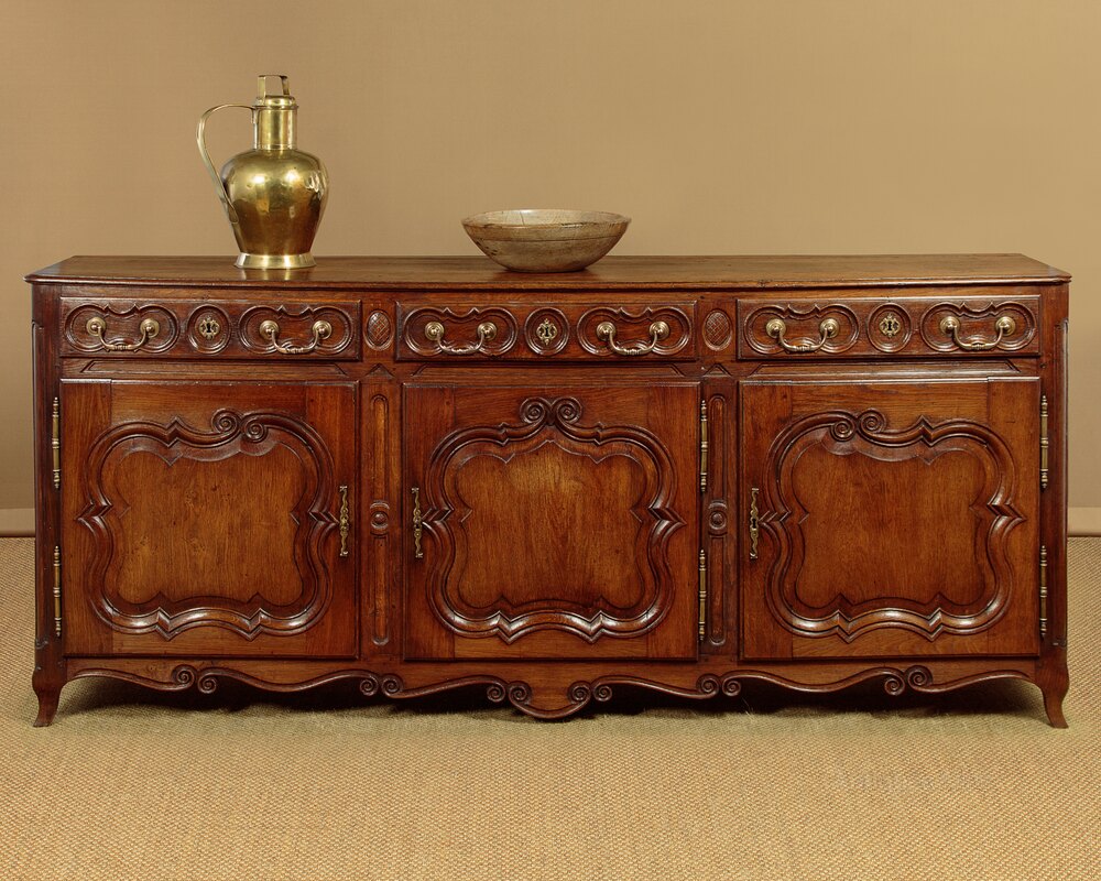 Unusually long late 18th.c. French oak sideboard or dresser c.1780. Very nearly seven and half feet long. Single piece top with rounded corners, a moulded edge and a plate groove along the back. Over three drawers and three cupboards, each fitted with a single shelf inside (internal depth 16"). Good decorative front with carved drawer fronts and shaped door panels within carved surround and a shaped and carved apron. Large brass handles, hinges and escutcheon plates. Oak panelled sides, pine drawer linings and backboards. Excellent colour and condition, cleaned and waxed in our workshops. Cupboard keys supplied.Width: 88.5" (225 cm)