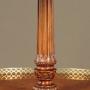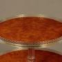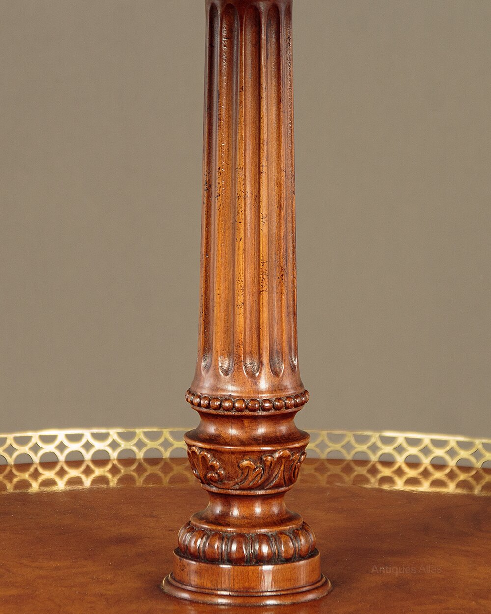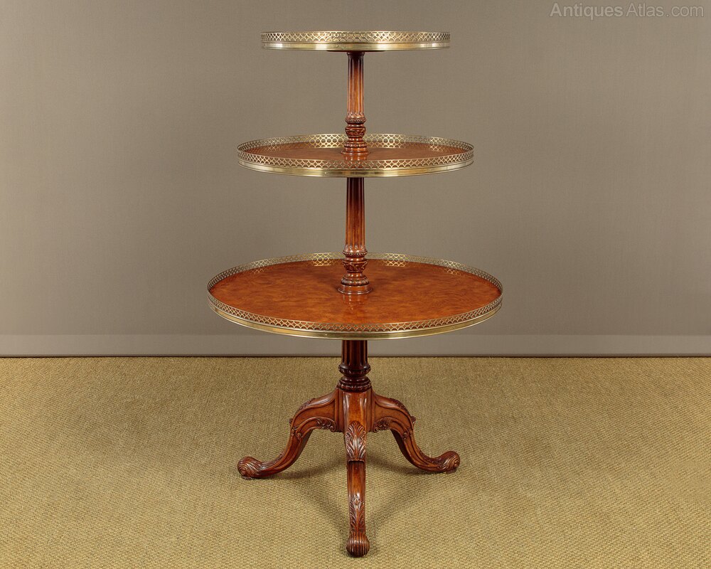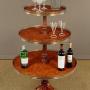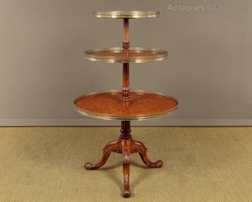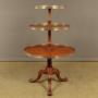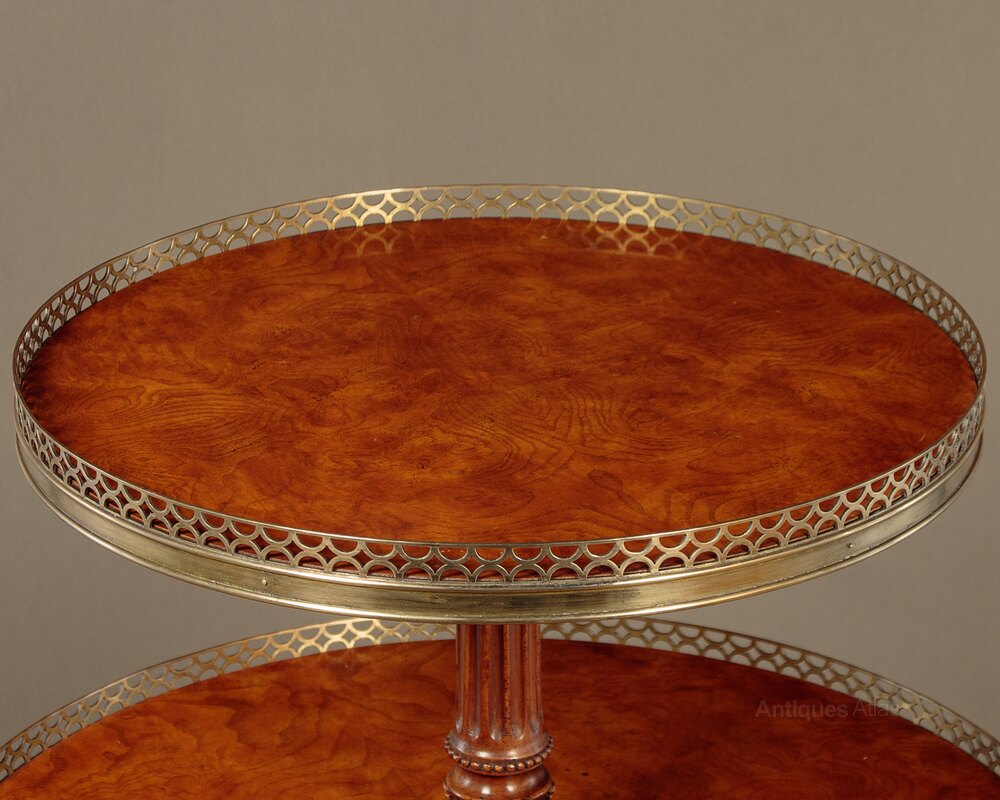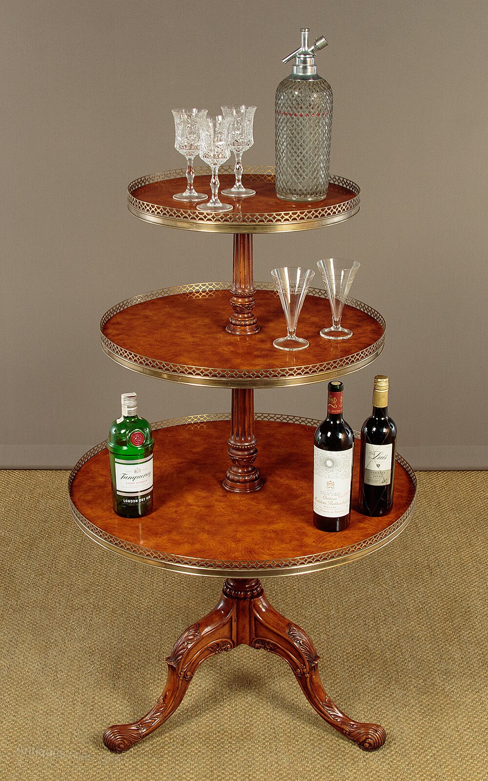 Unusual three tier dumb waiter in elm c.1960. Three circular shelves of graduated sizes (18½", 24½", 30" diameter) with raised and pierced brass galleries and wonderfully figured symmetrically arranged elm veneers. On a crisp turned carved and fluted column and tripod legs carved with acanthus at the knees and feet. Excellent colour and condition, cleaned and waxed in our workshops.Width: 30" (76 cm)
