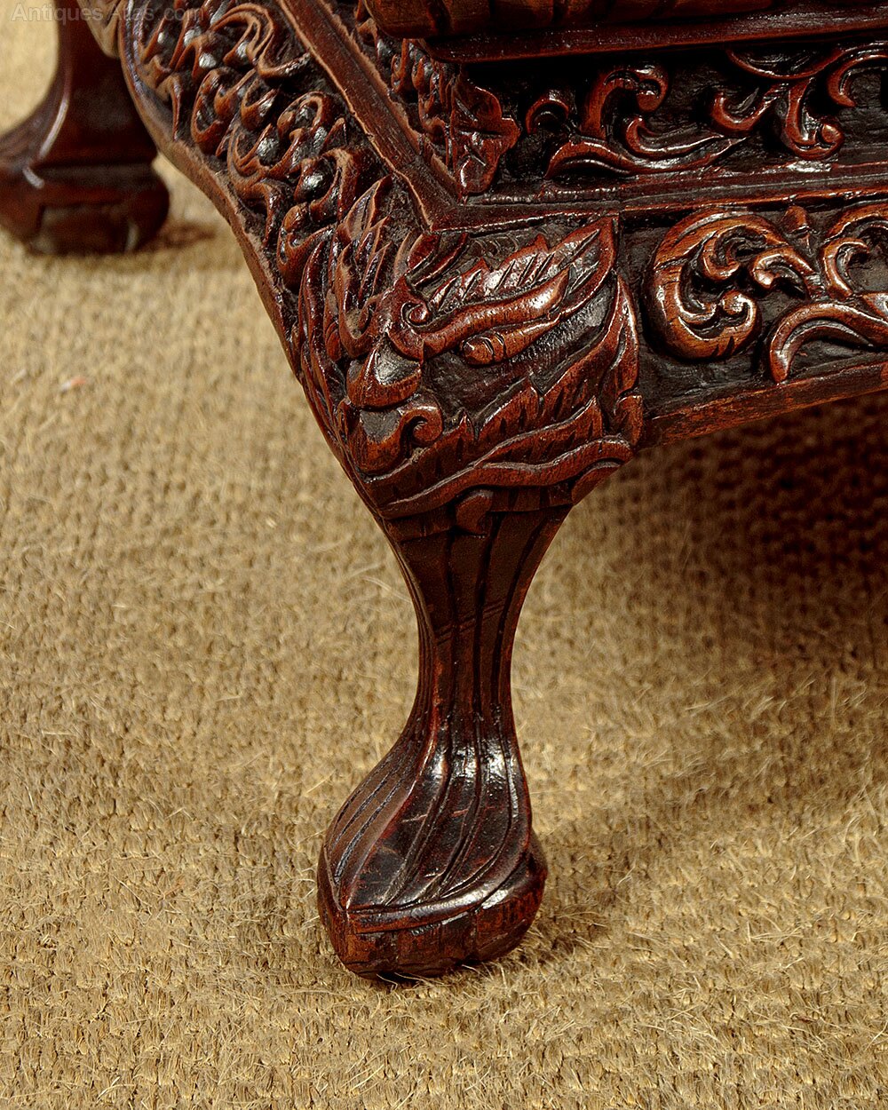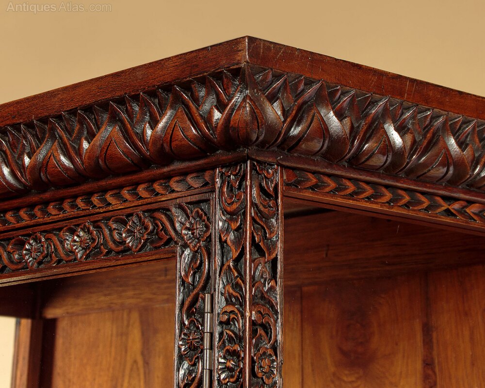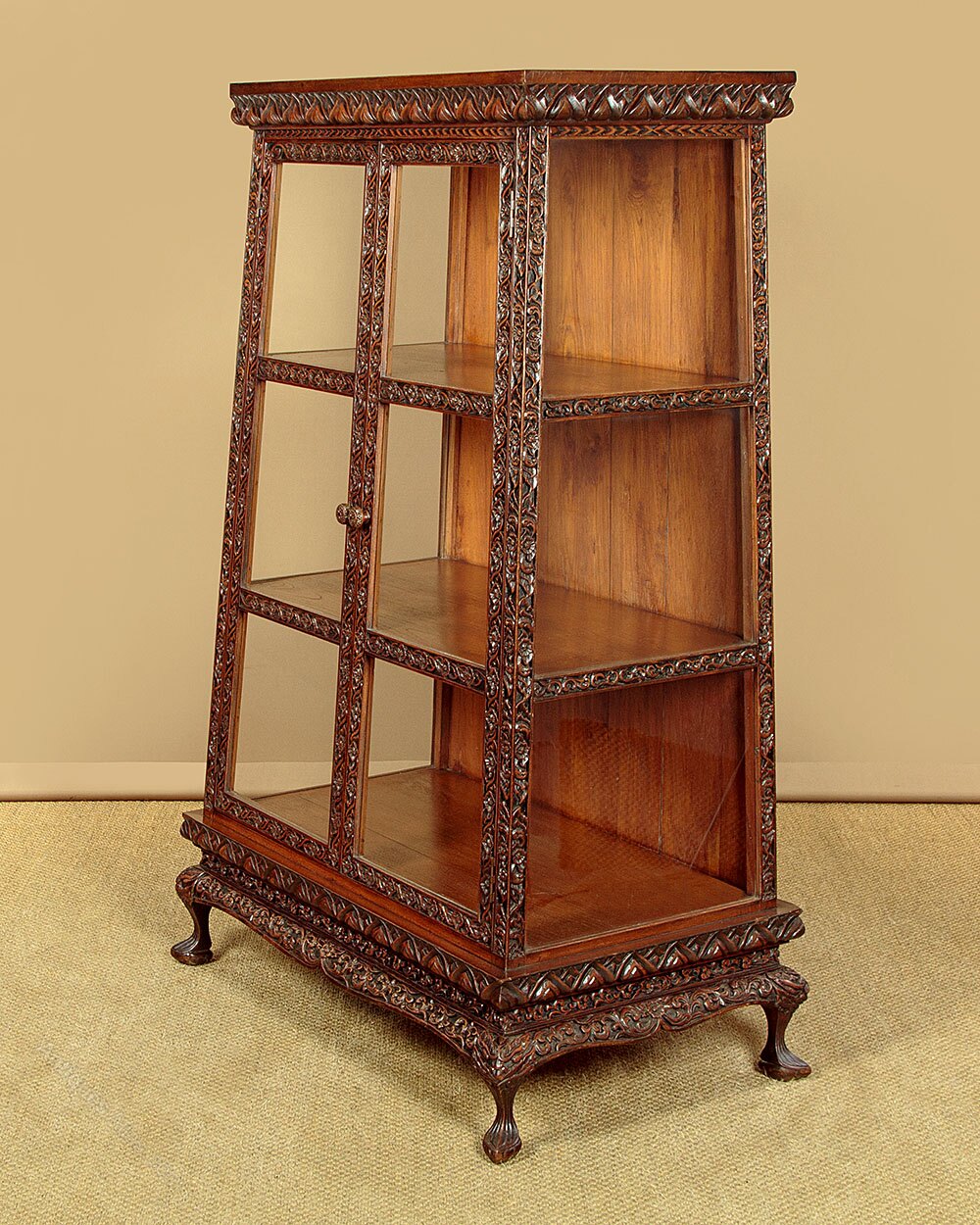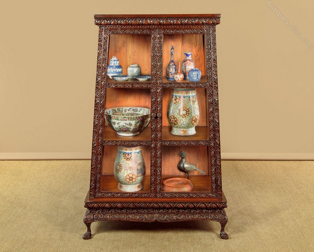 Rare early 20th.c. Anglo Indian or Chinese display cabinet c.1930. Of unusual tapering form narrowing in width and depth toward the top. Two door cabinet glazed on the front and sides and fitted inside with two shelves (internal depth of the shelves and base 16"/17"/18"). In solid hardwood (possibly padauk) the exterior carved with a frieze of lotus leaves around the top and bottom and a dense pattern of leaves and flowers to the frame. Raised on a shaped plinth carved with foliate detail and stylised dragon heads to the corners over neat little carved feet with pointed toes. Note how the carving is continued at the rear of the cabinet. Some wear and repairs around the base, generally excellent colour and condition, cleaned and waxed in our workshops.Width: 39" (99 cm)
