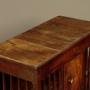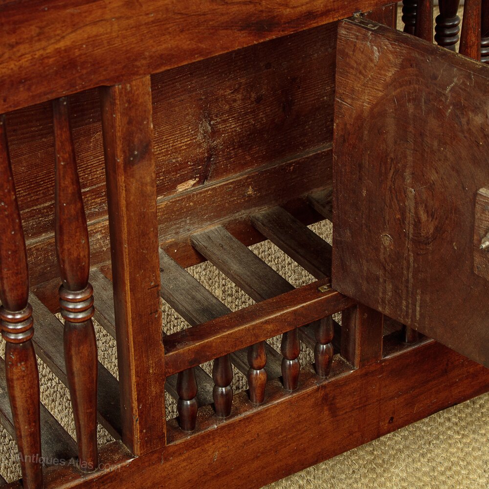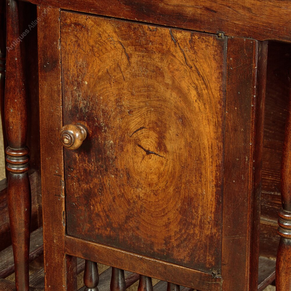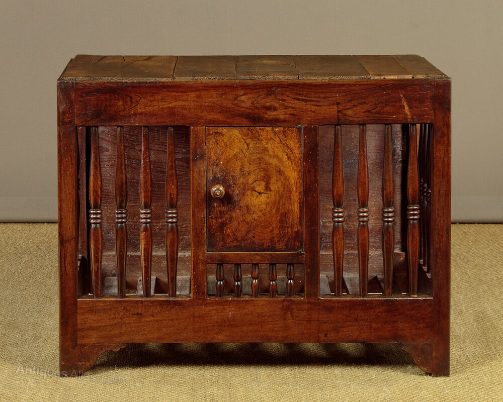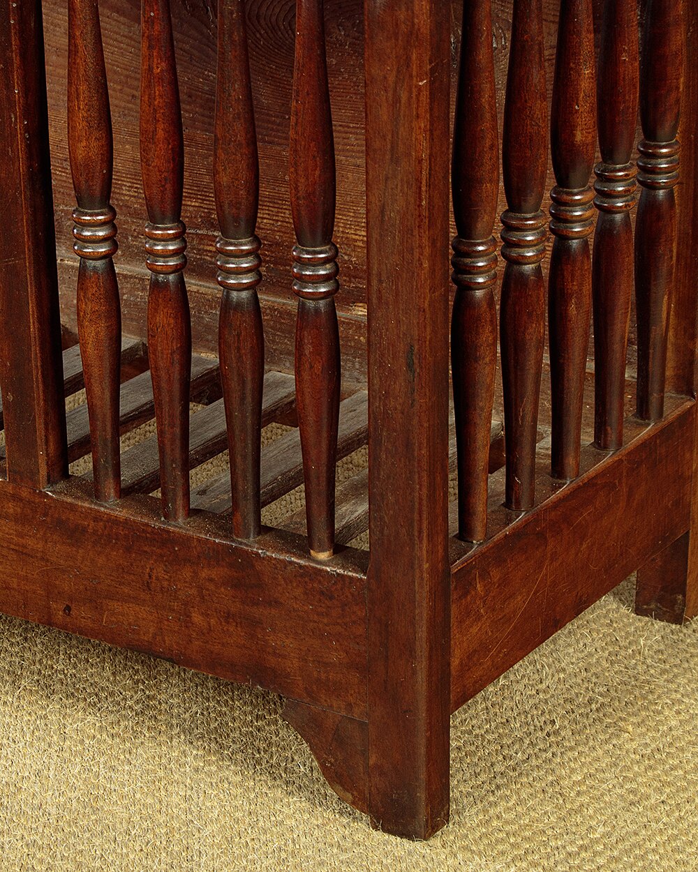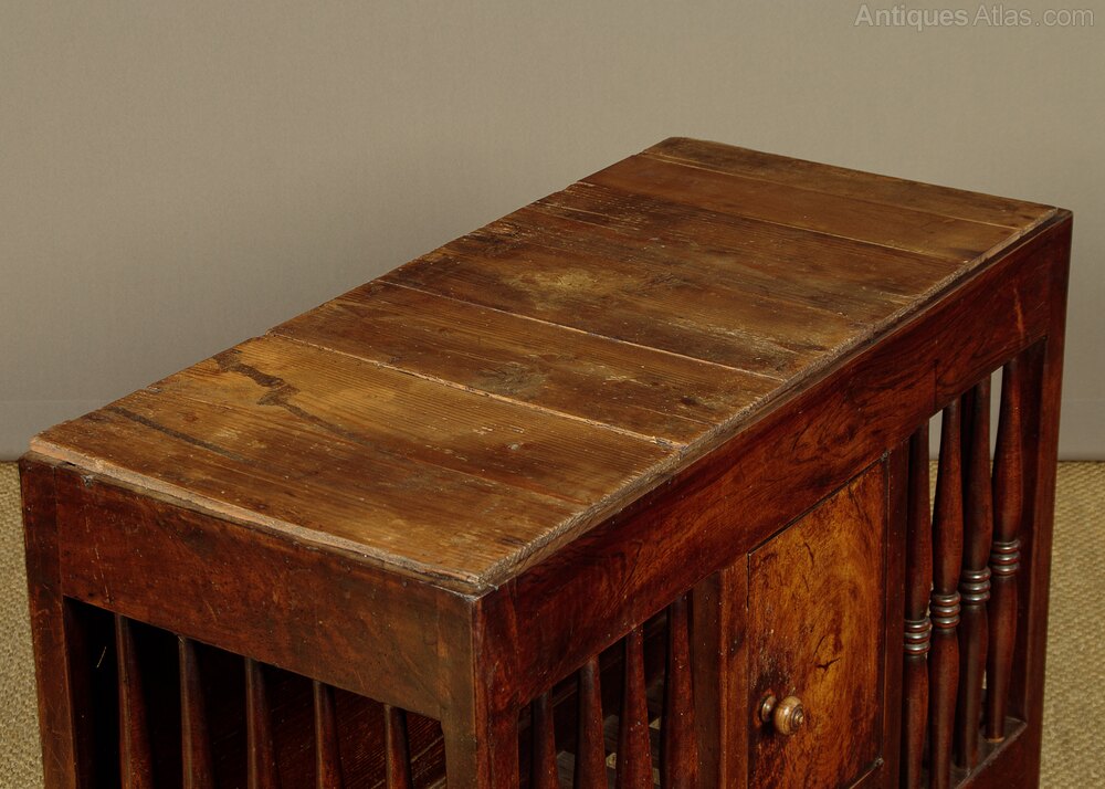 Early 19th.c. walnut panetiere or bread safe c.1820. Used for cooling and storing freshly baked bread for which it would be hung on a wall away from pests, the open sides and slatted base helping to prevent humidity which would cause the bread to spoil. A simple example of the form with 18 turned spindles to the front and sides between straight rails. Small door in the front with a twist catch attached to the knob. Pine top and back panel with holes in the rear for fixing to the wall. Missing a portion of the shaped bracket inside the right hand front foot. Otherwise very good original colour and condition. Cleaned and waxed in our workshops.Width: 35" (89 cm)