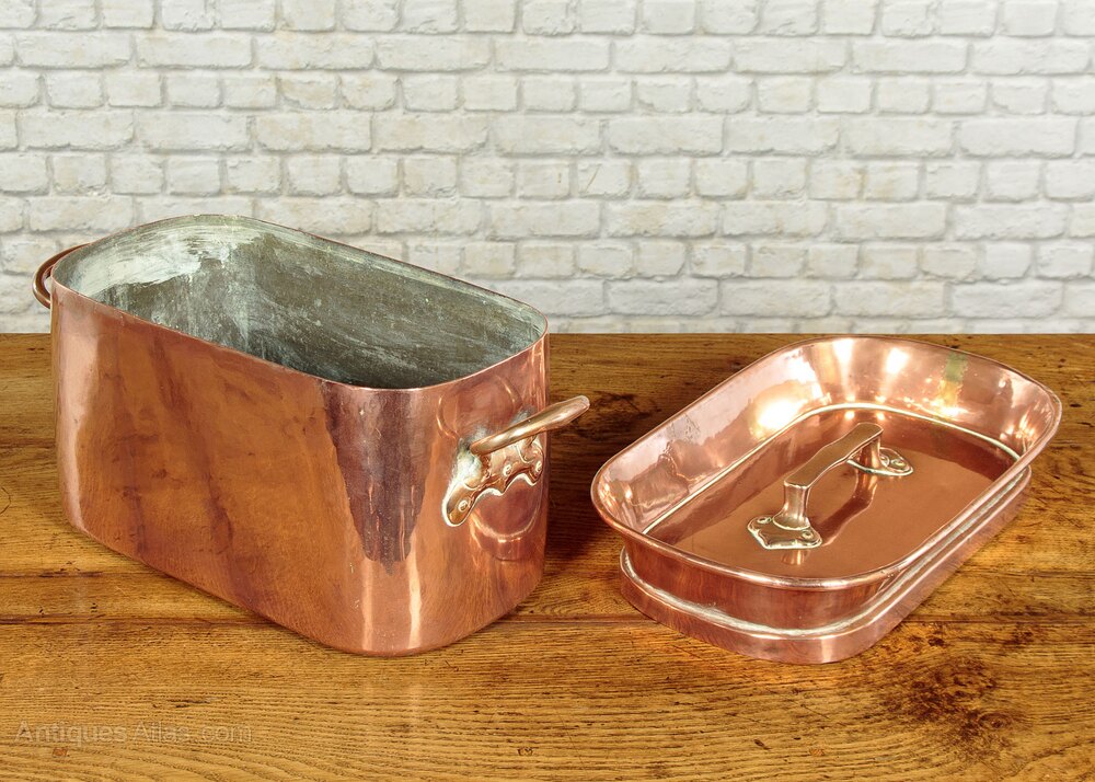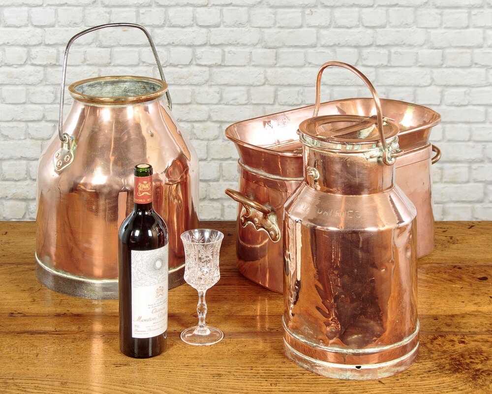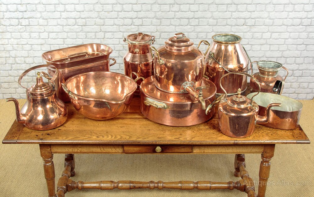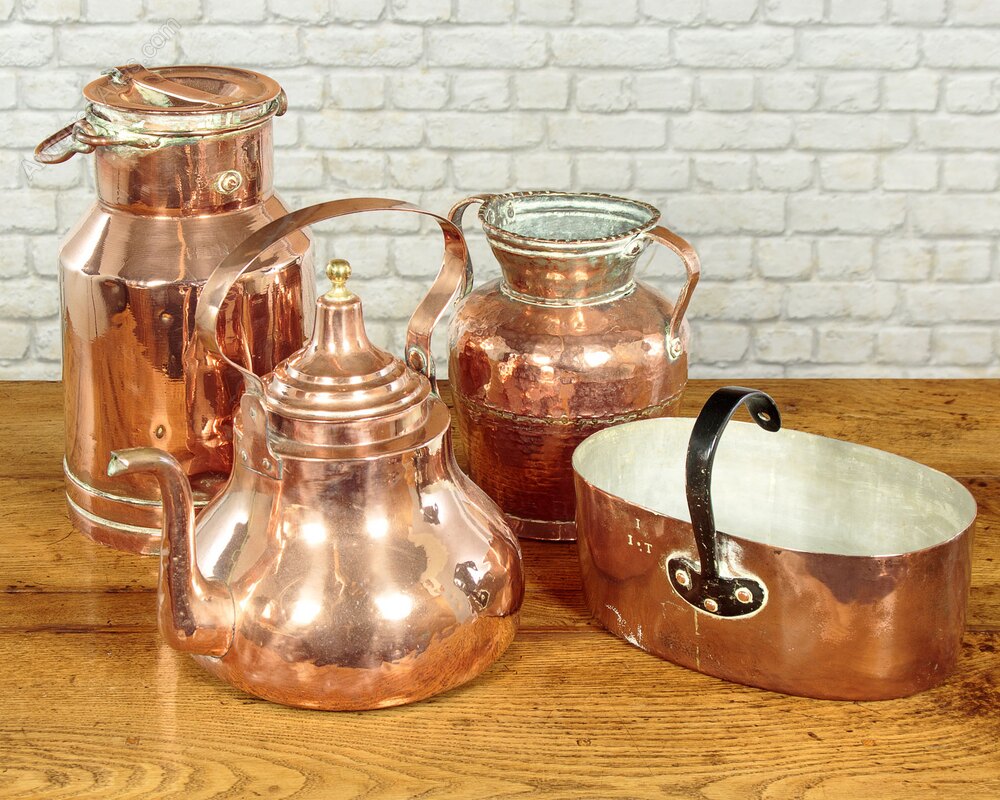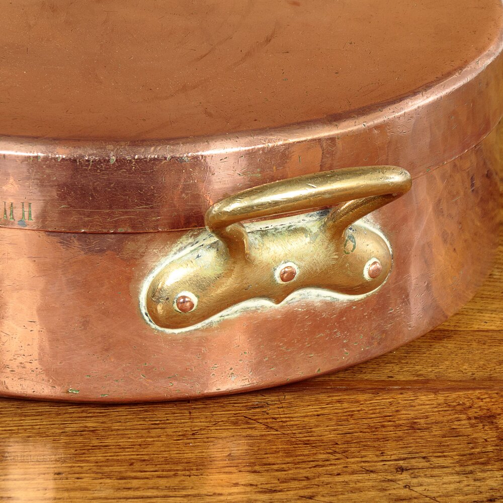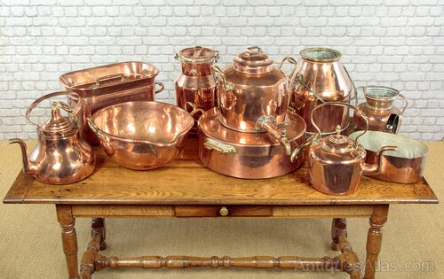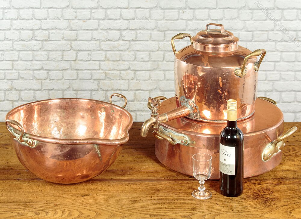 Superb collection of large antique copper kitchenware c.1890. Including an 18" diameter round pan with lid, a 16" diameter mixing bowl with spout, a very large kettle with a tap and an unusual 18" x 10" x 11" oblong pan and lid with deep raised sides. All with riveted brass handles and tinned interiors, some number and letter stamps Also several other kettles and pails. All in excellent condition.Please contact us for more images, delivery and shipping quotes. Alternatively you are welcome to view and collect at our large warehouse showroom in Llandudno Junction, North Wales (approximately 45mins from Chester). We have a large and ever changing selection of genuine good quality antique furniture of all types and have twice been shortlisted for the Home and Antiques Magazine Antique Shop of the Year Award. 01492 580022.