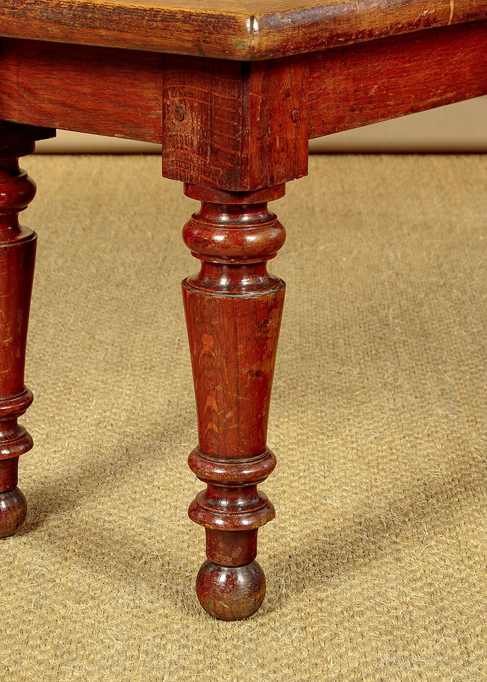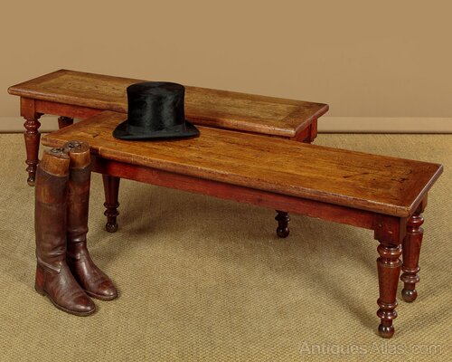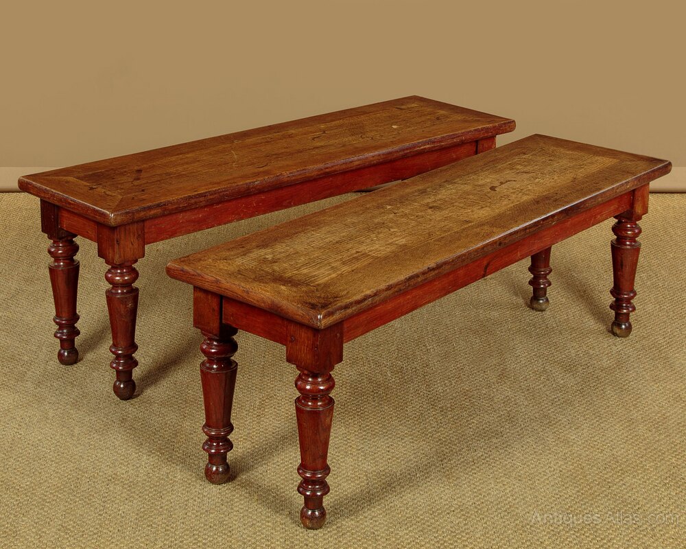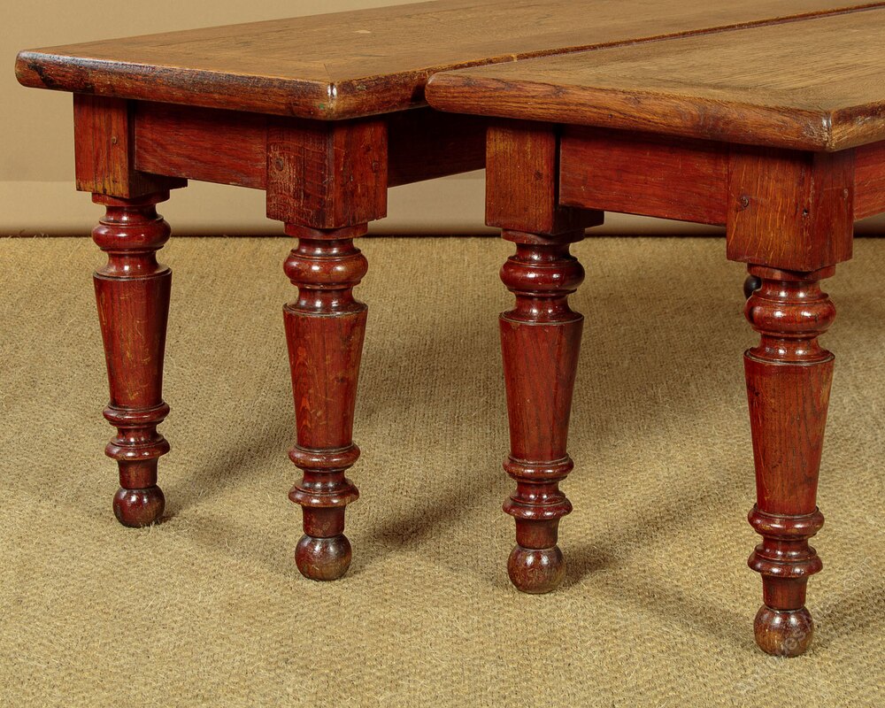 Good pair of sturdy oak benches c.1880. 51" x 15½" tops in 1¼" thick oak. Over a plain rails and raised on stout turned and tapering legs with pommel feet. Solid oak throughout. Excellent condition, cleaned and waxed in our workshops.Width: 15.5" (39.5 cm)