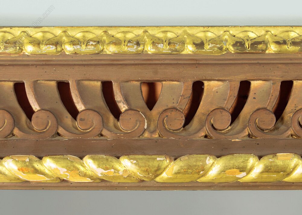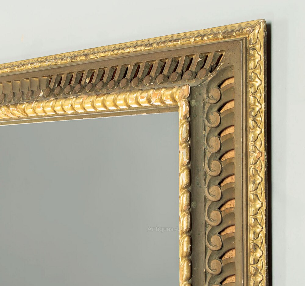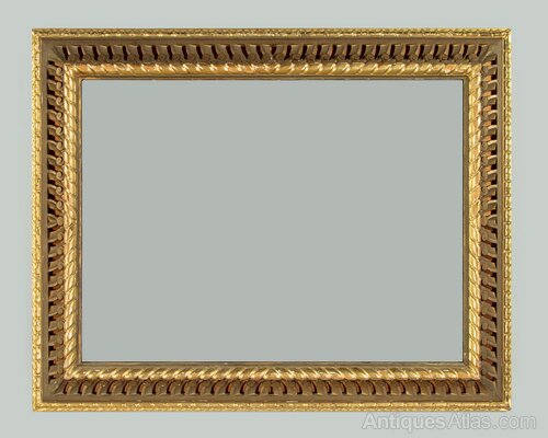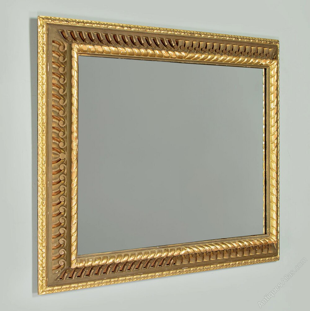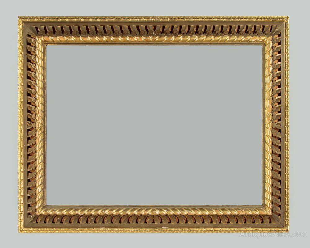Large carved and gilded cushion frame wall mirror. 35" x 26" mirror plate within a carved and pierced cushion frame of scrolling forms between two bands of gilding. Obvious wear to the gilding on the rope twist inner moulding where it is missing in large portions exposing the wood below. Otherwise good condition, fitted with a new mirror plate. Could be hung either landscape or portrait aspect.Width: 45.5" (115.5 cm)