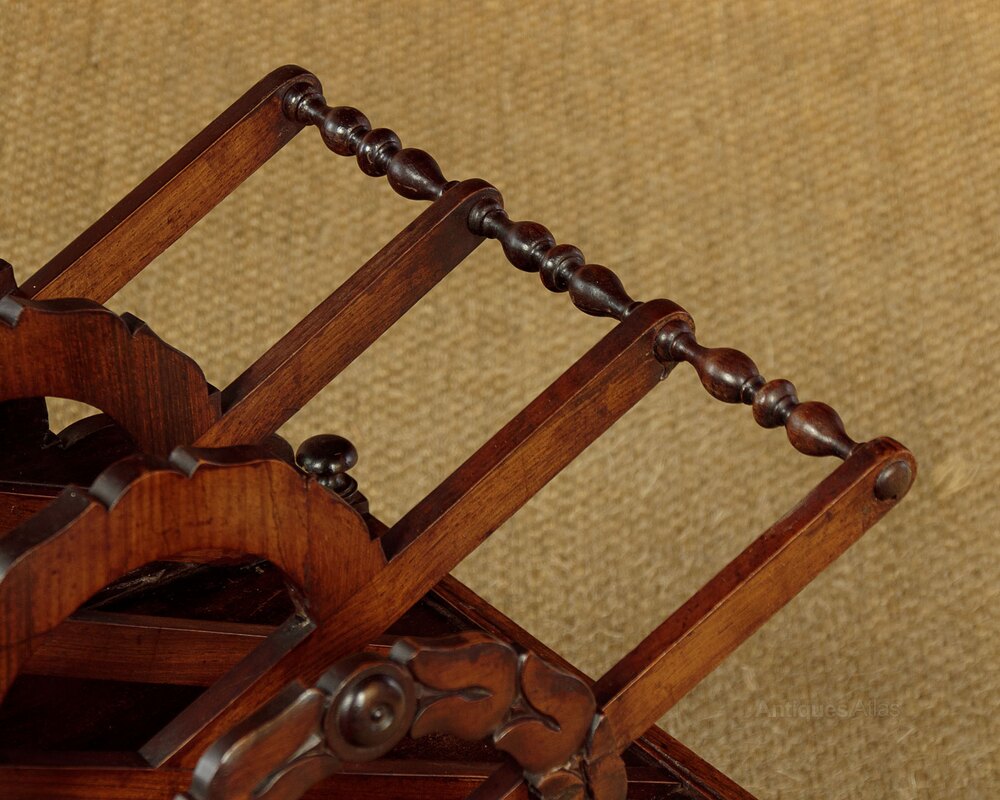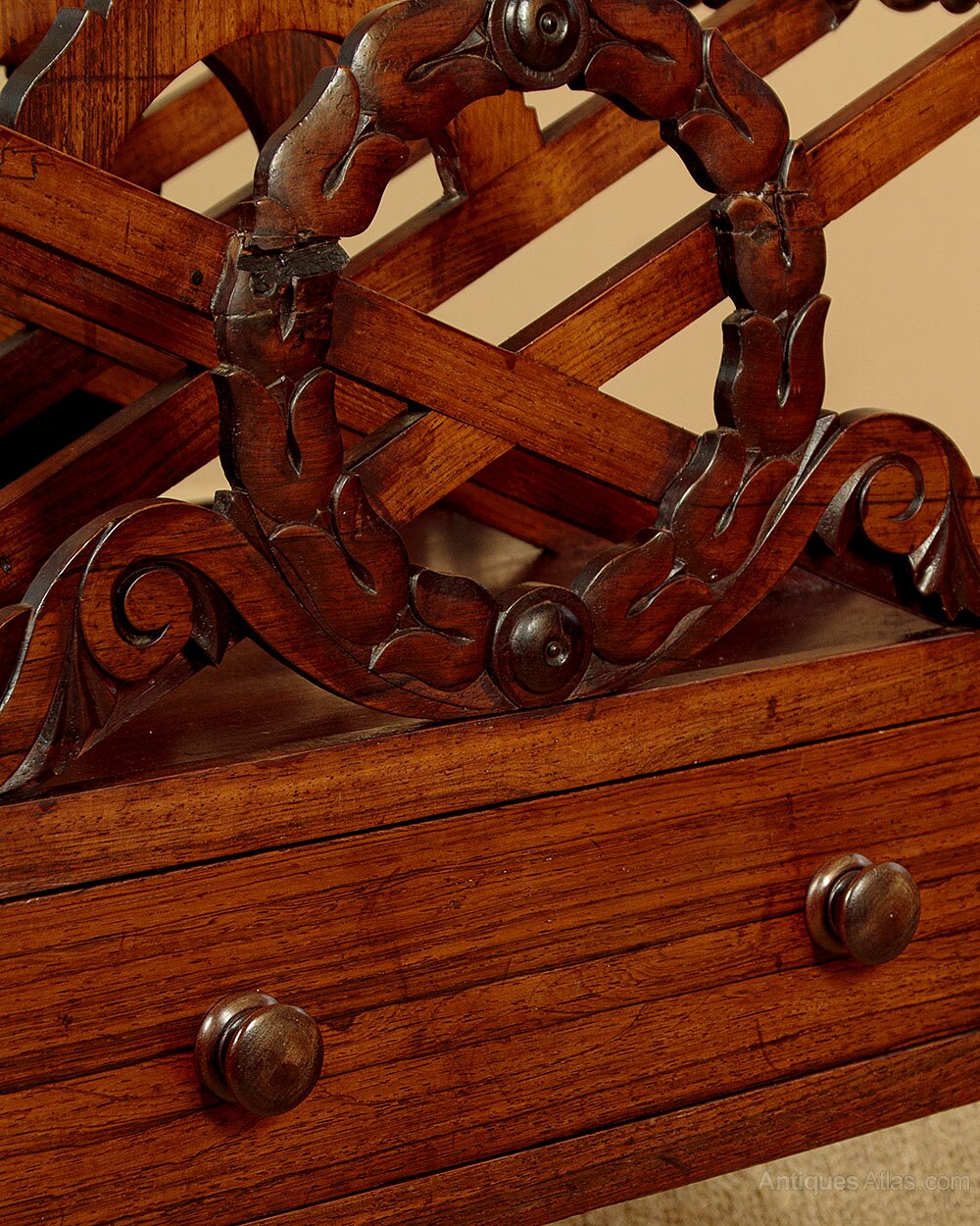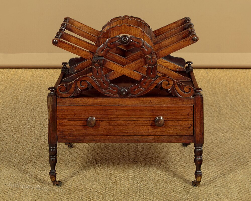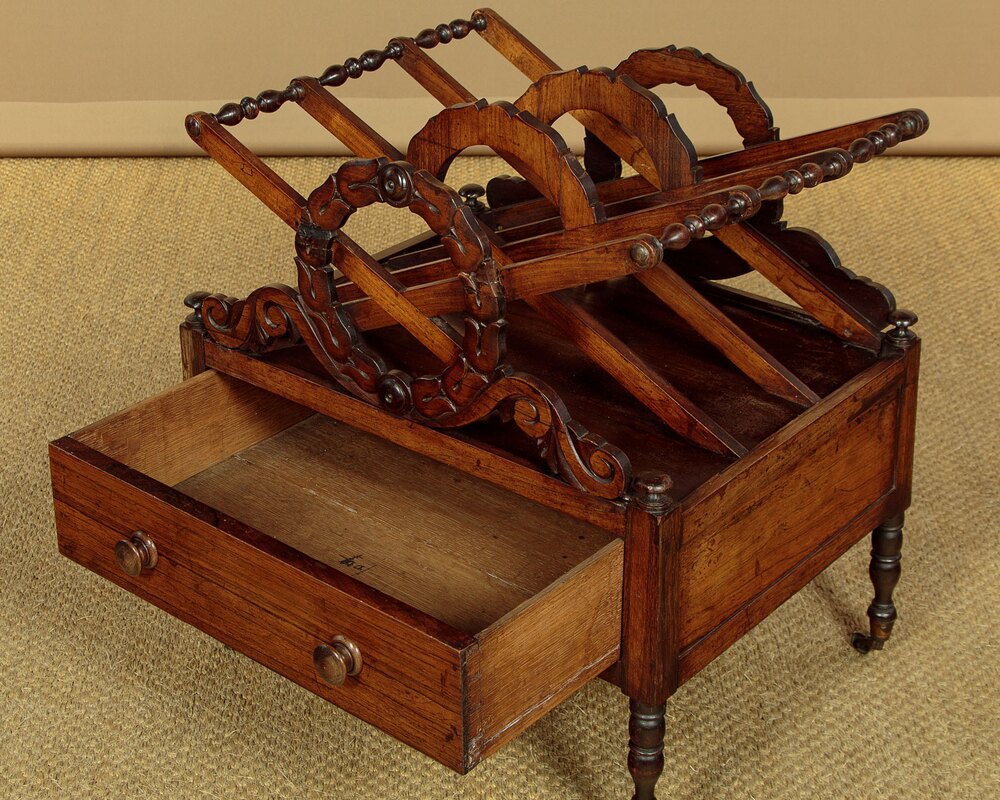 Mid 19th.c. rosewood Canterbury or book tidy c.1860. Three 16" wide x 4" deep sections to hold books, magazines etc. between crossed dividers joined with turned spindles at the upper points. Carved wreath design to the front, the shape of which is continued on the middle dividers with the carving repeated at the rear of the Canterbury. With a useful drawer in the base with turned knobs and oak drawer linings. Turned pommels at the corners. Raised on short turned legs with the original brass castors. Very good colour and condition, cleaned and waxed in our workshops.Width: 19.5" (49.5 cm)