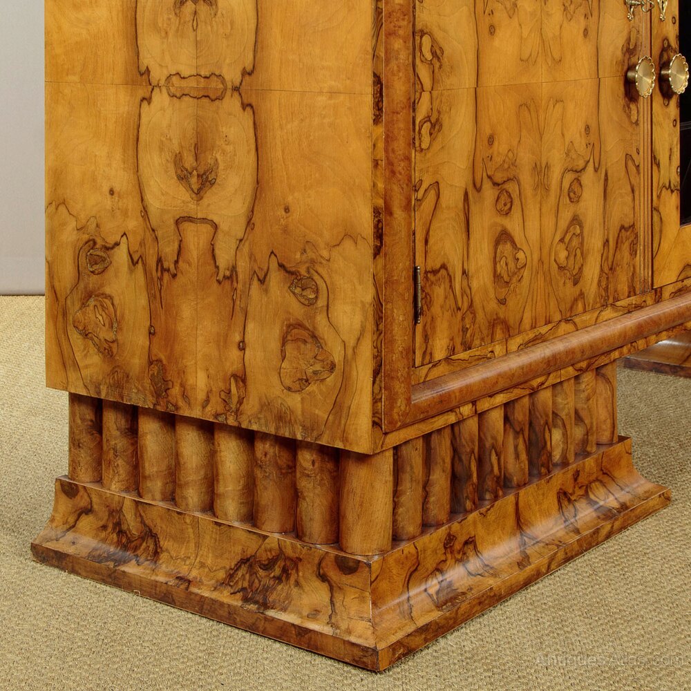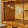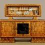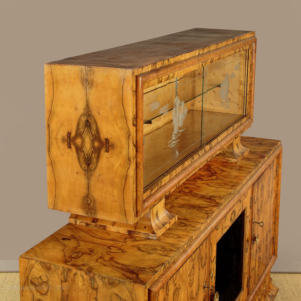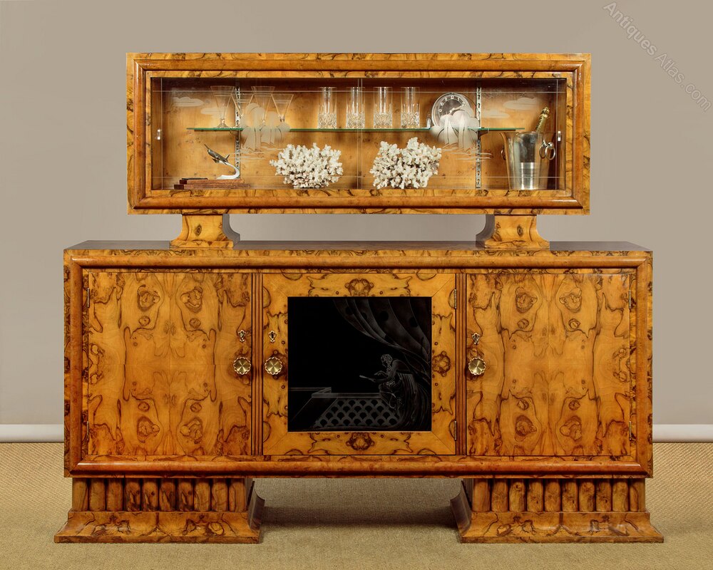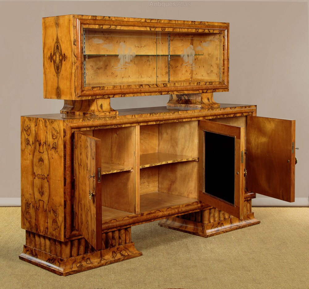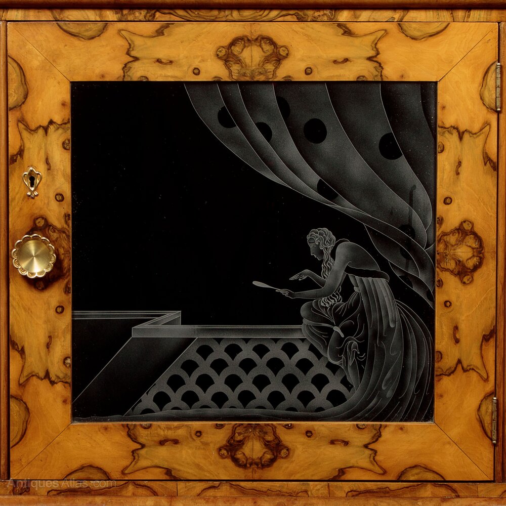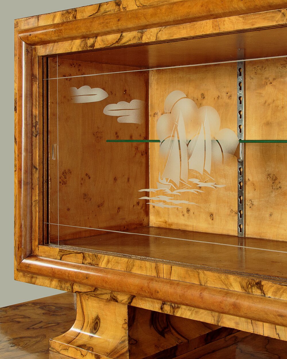Remarkable Italian Art Deco walnut sideboard c.1930. Separate display cabinet to the top fitted with a single plate glass shelf (internal depth 12") on adjustable chrome brackets. With the original sliding glass doors etched at the rear with a design of sail boats. Raised on flared plinths over a deeper three door cupboard base, each cupboard fitted inside with a single shelf (internal depth 17"). Glass panel to the centre door featuring a remarkable hand-cut etched Neo-Classical style illustration of a woman (Helen of Troy perhaps?) in a flowing robe sat on a low wall and looking into a hand mirror. The glass panel is backed with a black vinyl type material to make the design stand out to dramatic effect. Highly figured walnut veneers laid to create a symmetrical pattern across the exterior. With broad raised mouldings framing the fronts of both the upper and lower cabinets and original brass rosette handles. Raised on massive reeded column legs (continuing the Classical theme) with flared bases. Very good condition, cleaned and waxed in our workshops. Keys supplied.Separates into two sections for delivery.