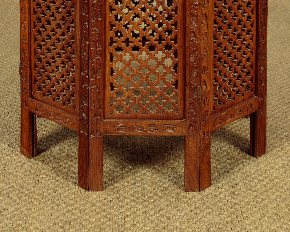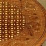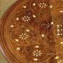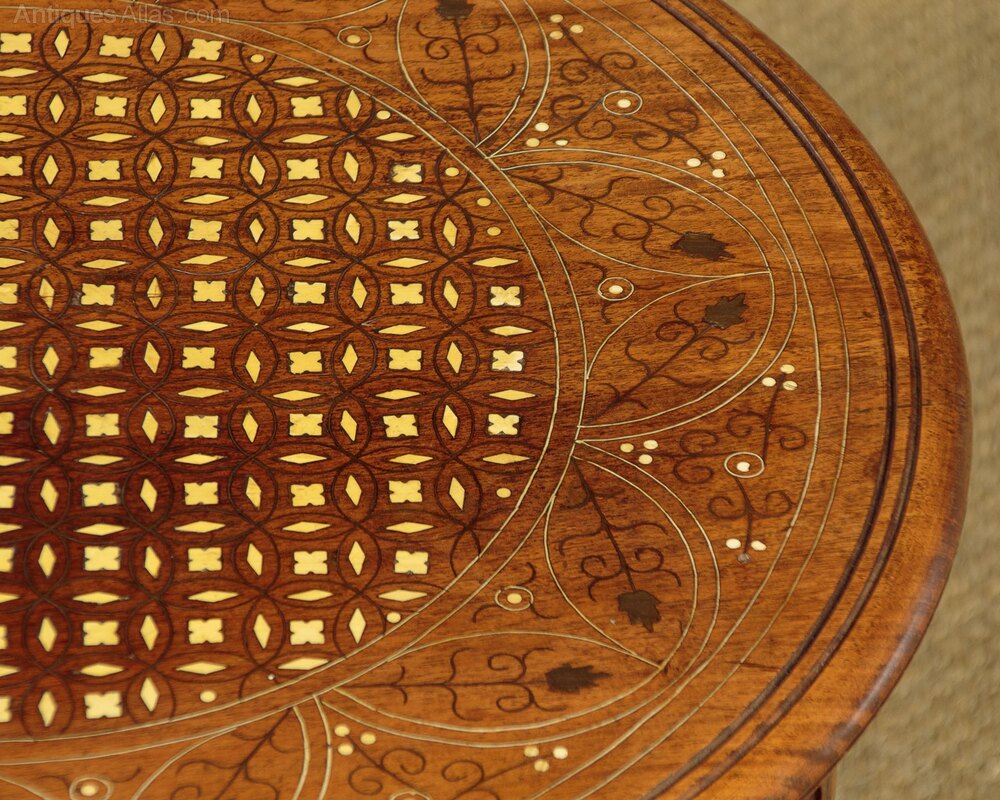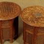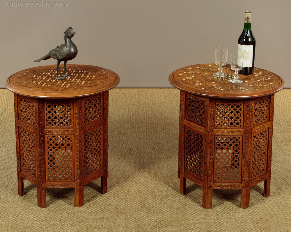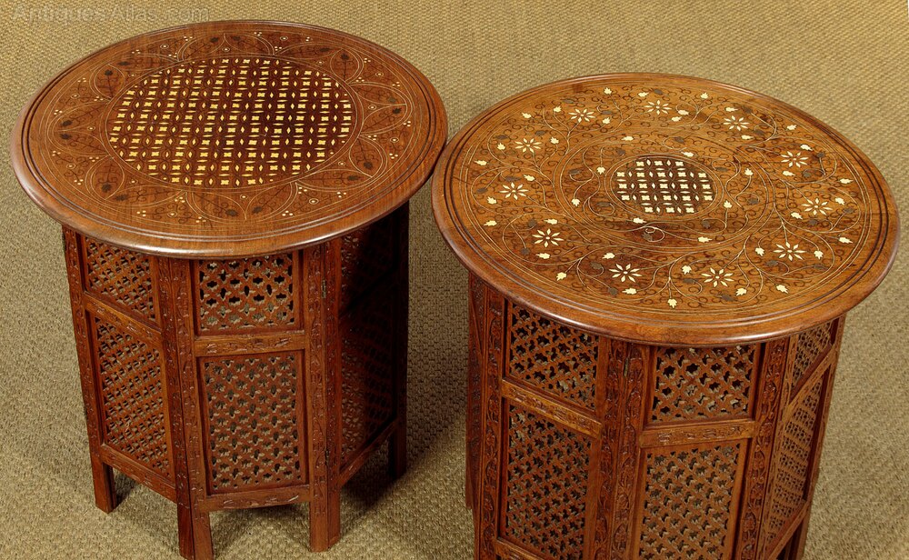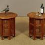 Pair of low Arabic or Moorish style side tables c.1960. 21" diameter tops in walnut or similar with fine inlaid decoration in brass and bone to create elaborate Islamic style patters with complimentary floral and foliate detail (note the brass leaves used on both tables). With a simple moulded and rounded edge to both tops. Raised on octagonal bases with matching pierced decoration to the panels and carved detail to the frames. Small paper labels to the underside of both tables priced in Saudi Riyals. Excellent colour and condition, cleaned and waxed in our workshops.Height: 21.5" (54.5 cm)