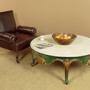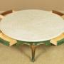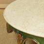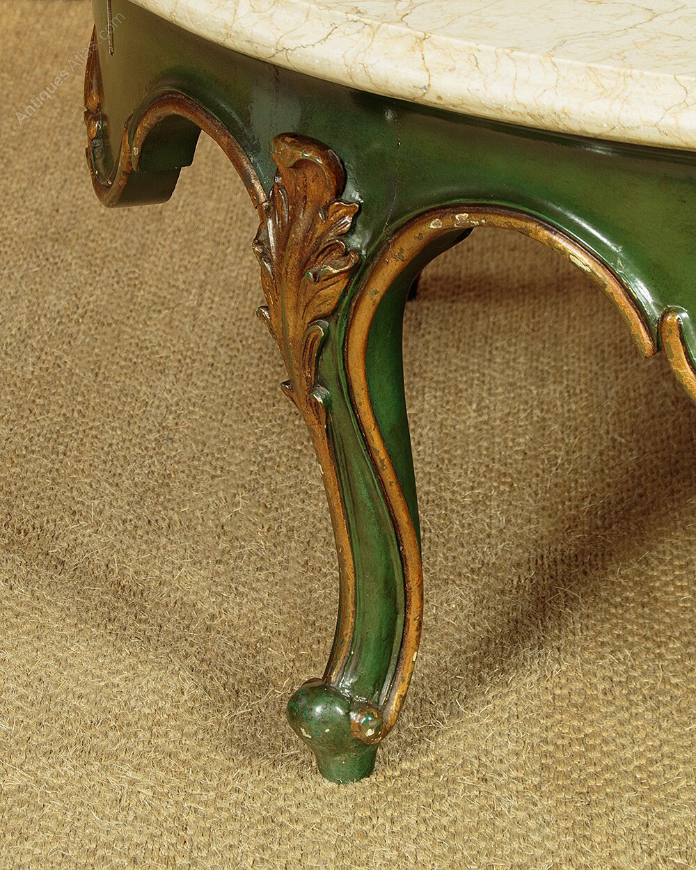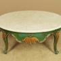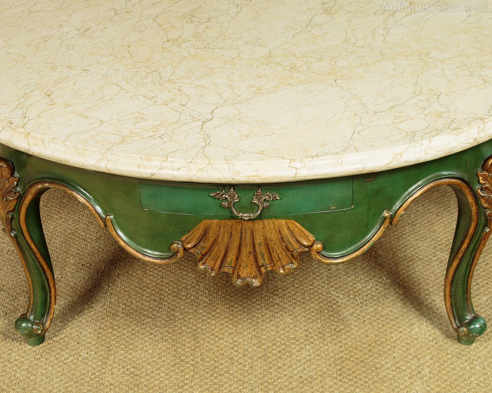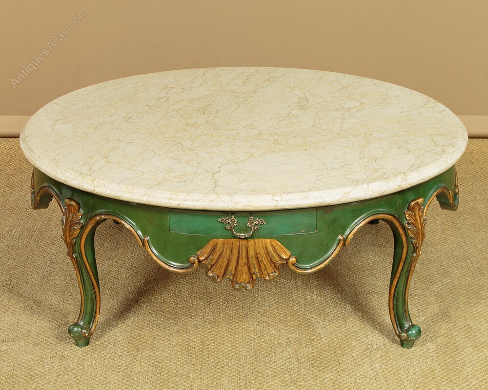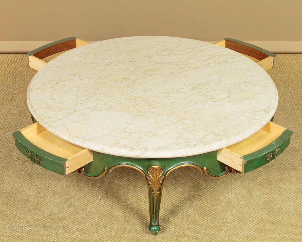 Impressive circular marble top coffee table c.1960. 47" diameter top in a pale marble with a deep moulded edge. On a shapely carved wooden base with four drawers with decorative brass handles. Attractive moss green paintwork with large carved and gilded scallop detail below the drawers and acanthus leaves to the legs. Further gilding to the moulding around the apron and continuing down the legs. Some minor wear to the paintwork, otherwise very good condition.Height: 18" (45.5 cm)