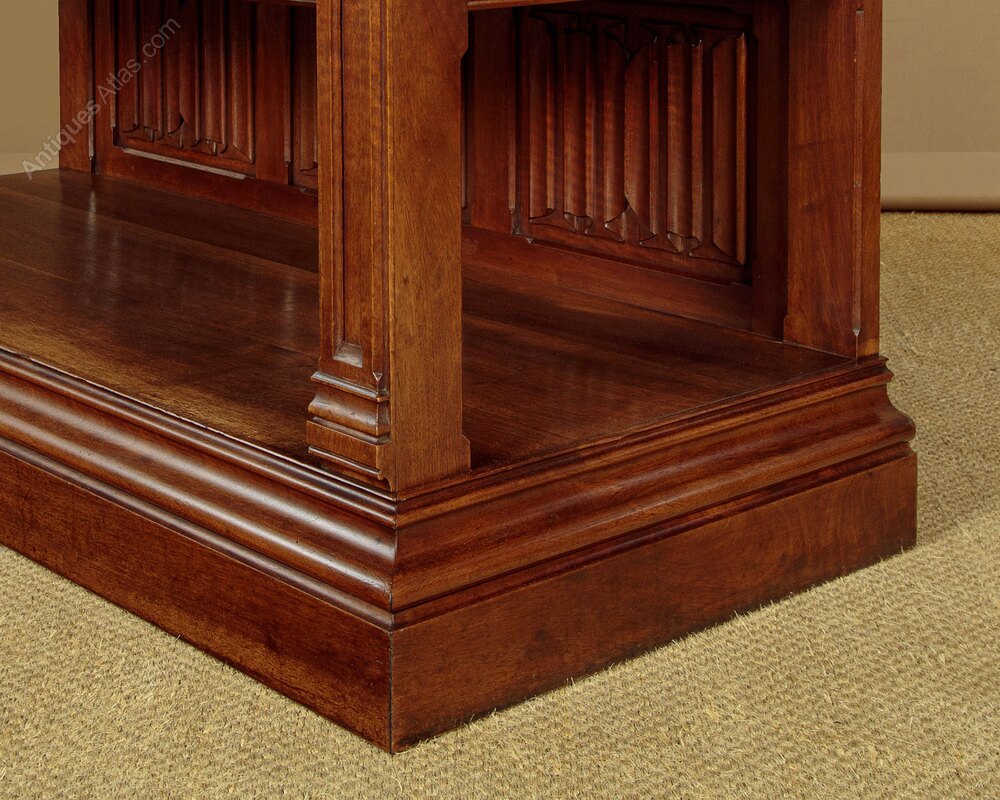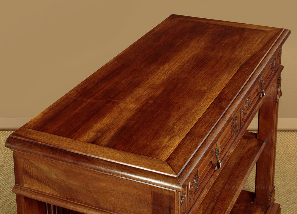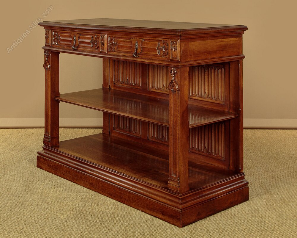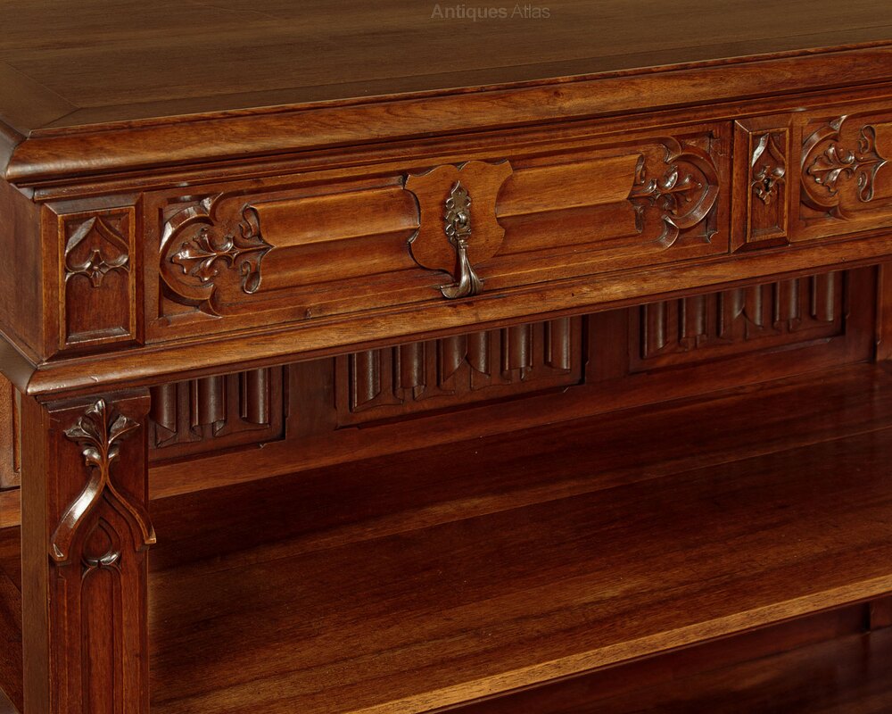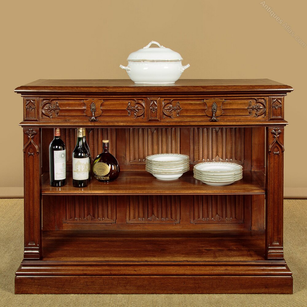 Superb quality Gothic revival carved buffet sideboard in walnut c.1880. Solid walnut top with a deep moulded edge over two drawers and two open shelves. Beautifully carved decoration to the drawer fronts featuring a shield cartouche over linenfold and trefoil leaf detail with fabulous original iron handles. Blind Gothic tracery carving flanking the drawers and running down the length of the front stiles. Note also the six linenfold carved back panels. Open sides. Raised on a substantial plinth with deep ogee moulded edge. Oak drawer linings. Excellent colour and condition, cleaned and waxed in our workshops.Width: 51" (129.5 cm)