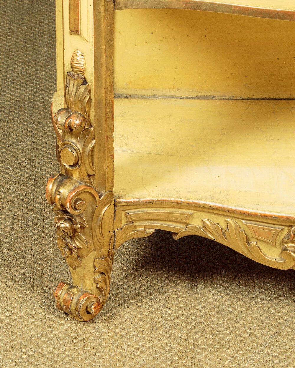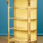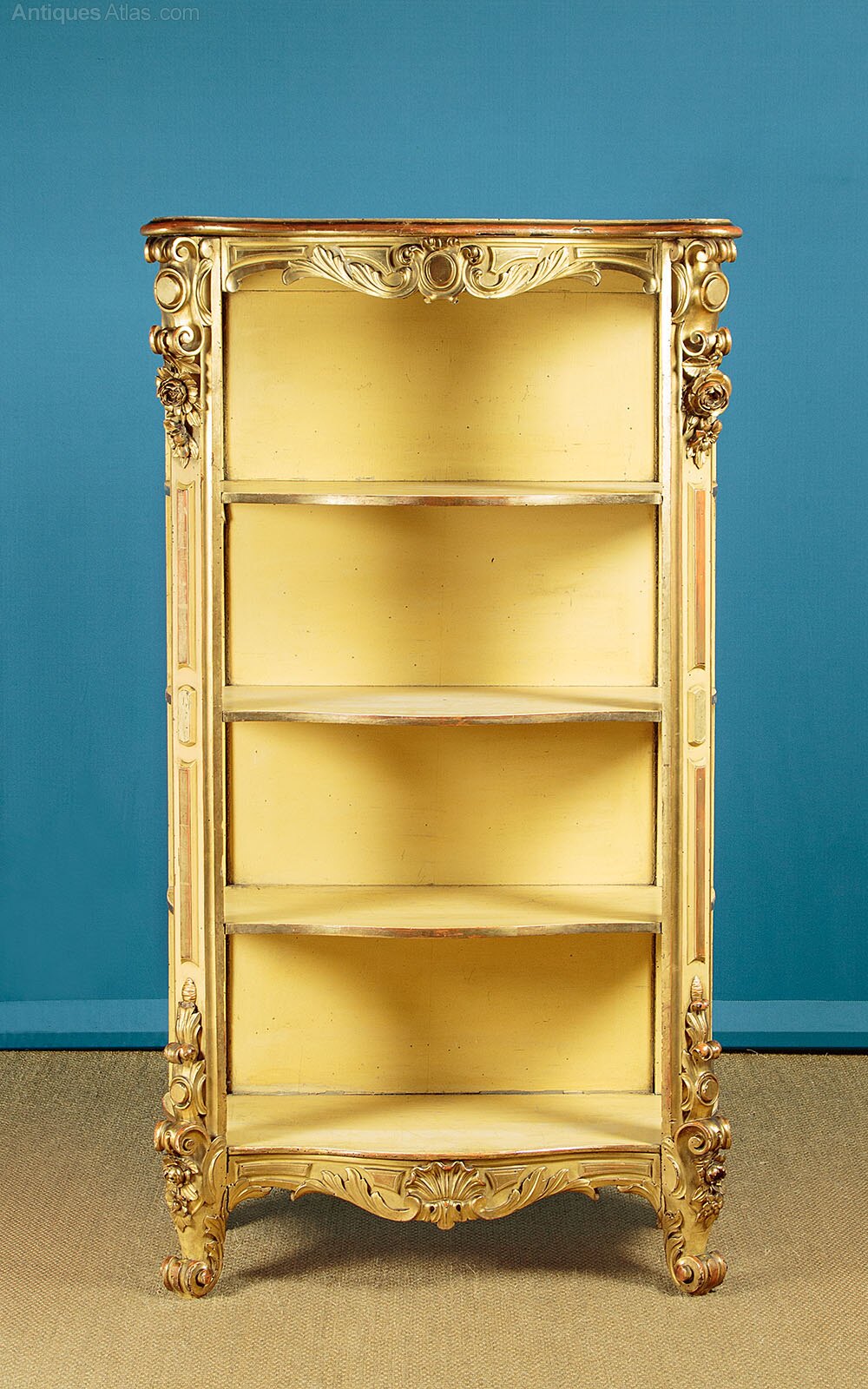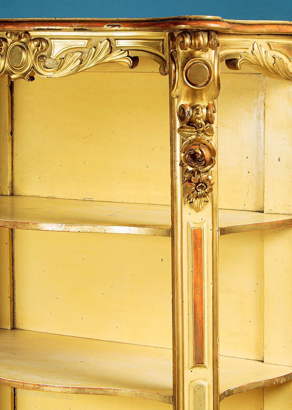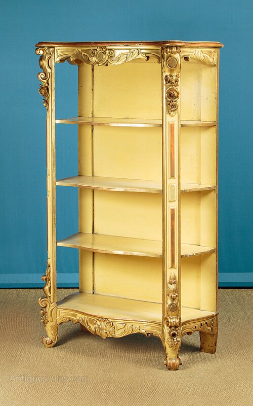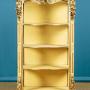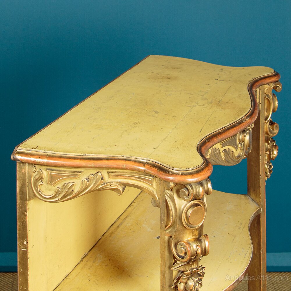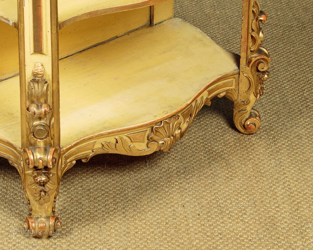Unusual late 19th.c. carved giltwood open shelves or whatnot c.1890. Useful narrow dimensions, just 30" wide. Ideal as a bookcase or as towel stand in a bathroom perhaps. Serpentine shaped top with a moulded edge over four conforming shelves (max depth 13½"). Carved acanthus detail to the apron around the top and below the bottom shelf, scrolling corbels and flower heads carved in high relief to the front stiles top and bottom, scrolling acanthus front feet. Original gilded finish, heavily worn and rubbed through in places to reveal the red ground below. Shelves and back panel painted pale yellow. Obvious wear and some old woodworm holes. Otherwise good condition, solid and sturdy, cleaned and waxed in our workshops.Width: 30" (76 cm)
